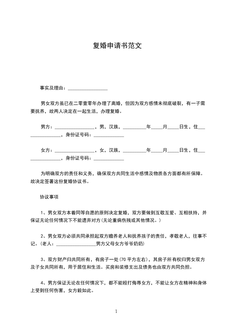 1、男女双方本着同等自愿的原则决定复婚,双方要做到互敬互爱、互相扶持,并保证无论任何情况下不能遗弃对方(无论重病伤残或其他情况。)