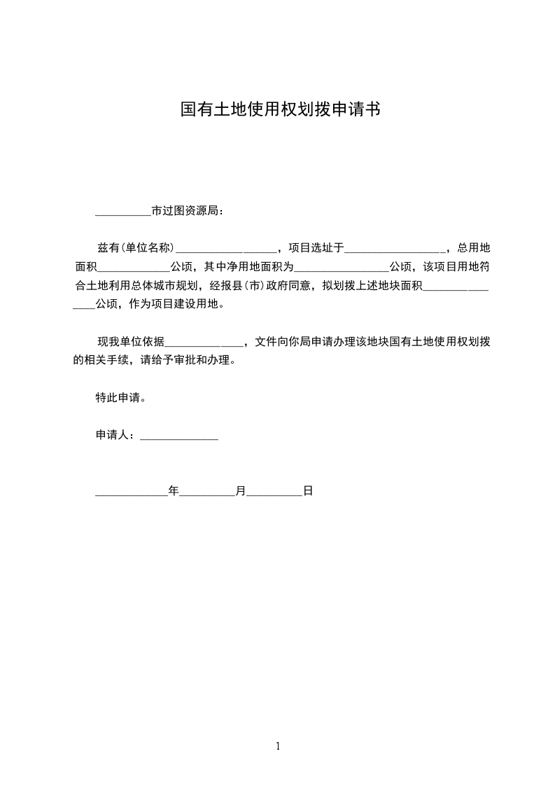 兹有(单位名称)__________________,项目选址于__________________,总用地面积_____________公顷,其中净用地面积为_________________公顷,该项目用地符合土地利用总体城市规划,经报县(市)政府同意,拟划拨上述地块面积________________公顷,作为项目建设用地。