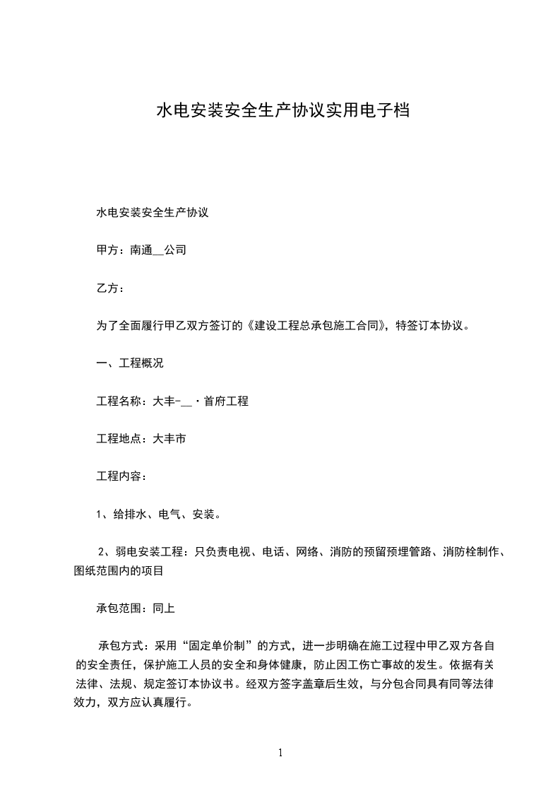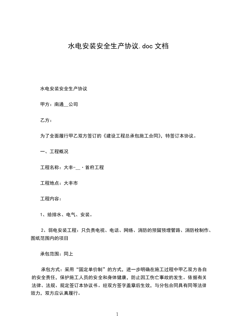 承包方式:采用“固定单价制”的方式,进一步明确在施工过程中甲乙双方各自的安全责任,保护施工人员的安全和身体健康,防止因工伤亡事故的发生。依据有关法律、法规、规定签订本协议书。经双方签字盖章后生效,与分包合同具有同等法律效力,双方应认真履行。