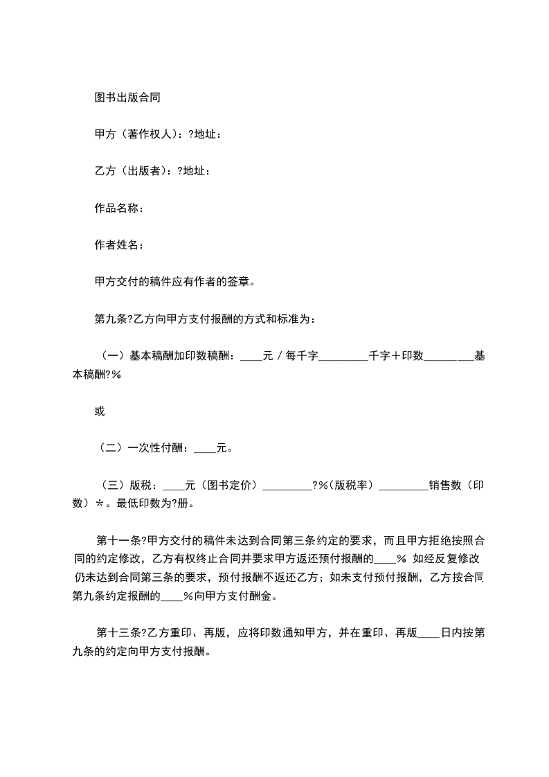 (三)版税:__元(图书定价)_________?%(版税率)_________销售数(印数)*。最低印数为?册。