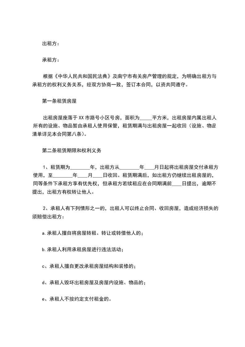 根据《中华人民共和国民法典》及南宁市有关房产管理的规定,为明确出租方与承租方的权利义务关系,经双方协商一致,签订本合同,以资共同遵守。