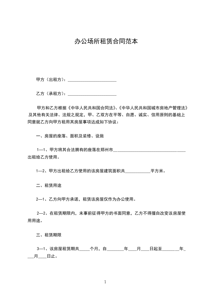 1—1、甲方将其合法拥有的座落在郑州市__________________________________出租给乙方使用。