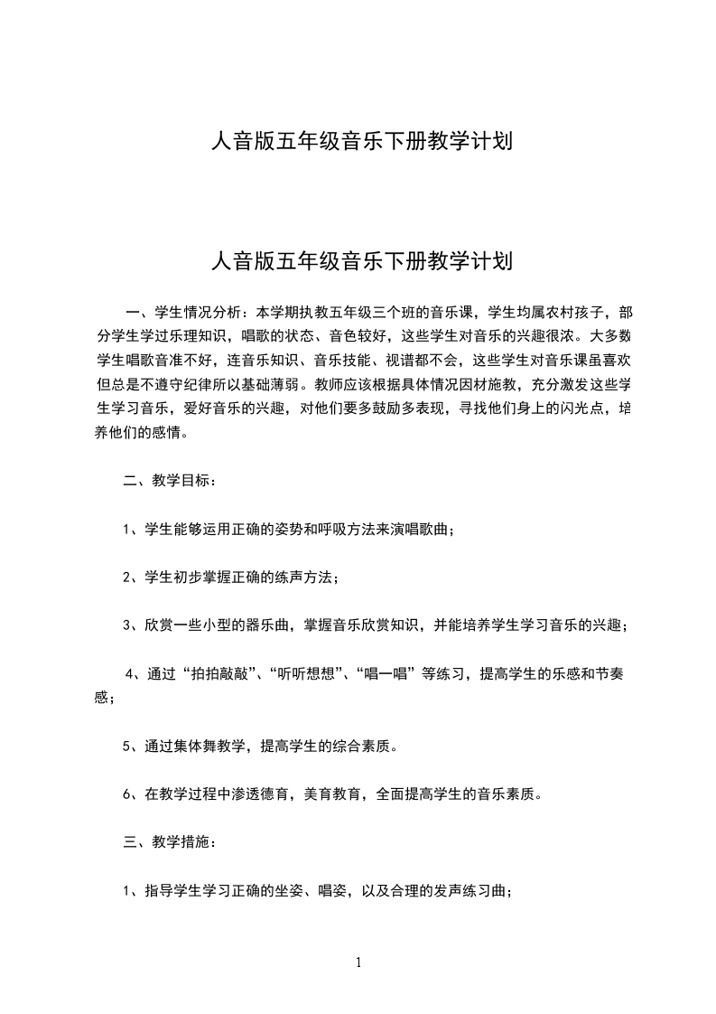 人音版五年级音乐下册教学计划