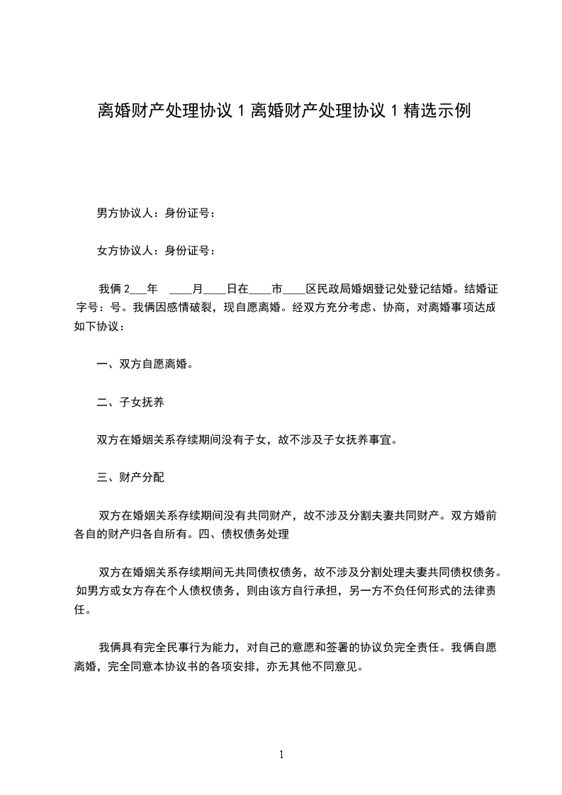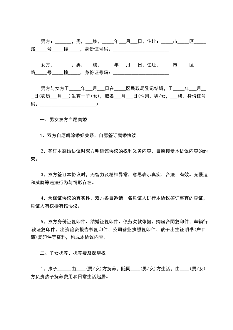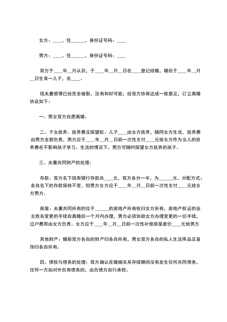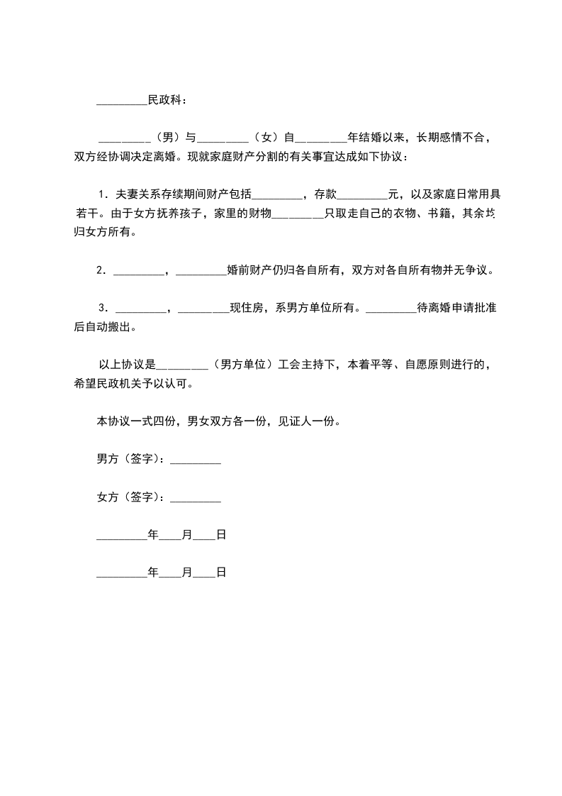 _________(男)与_________(女)自_________年结婚以来,长期感情不合,双方经协调决定离婚。现就家庭财产分割的有关事宜达成如下协议: