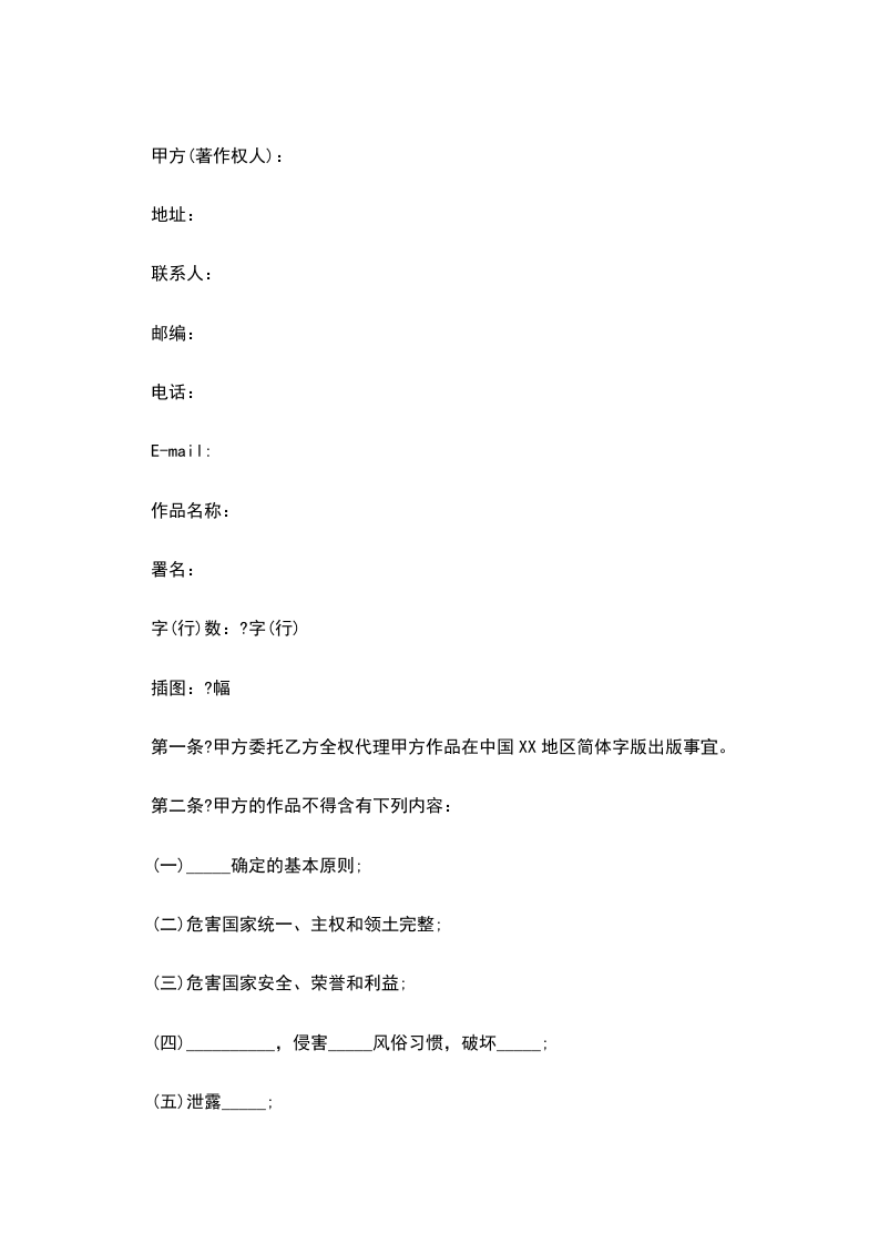 第一条甲方授权乙方在本合同有效期内,按本合同的约定以各种中文版本的形式出版本作品,并在国内外公开发行。乙方拥有本作品的专有出版权。