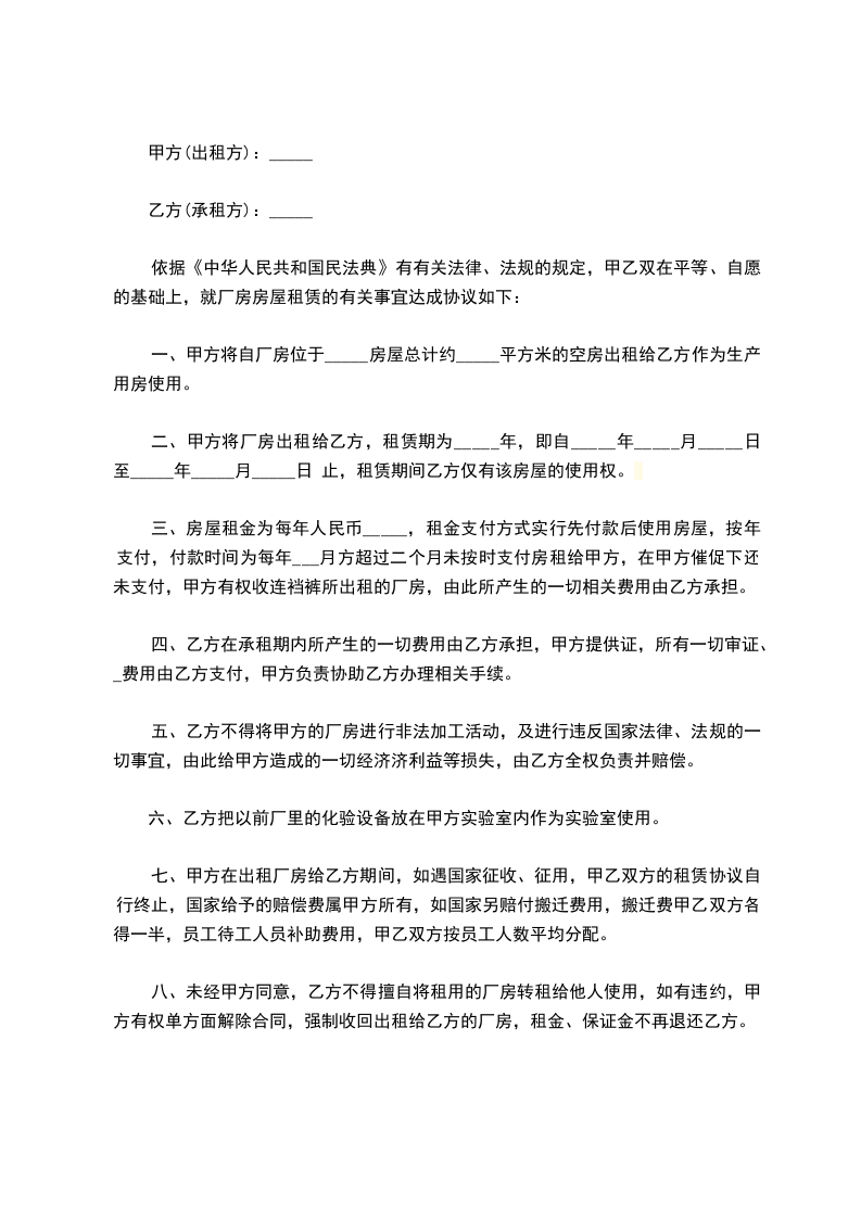 根据国家有关规定,甲、乙双方在自愿、平等、互利的基础上就甲方将其合法拥有的厂房出租给乙方使用的有关事宜,双方达成协议并签定合同如下: