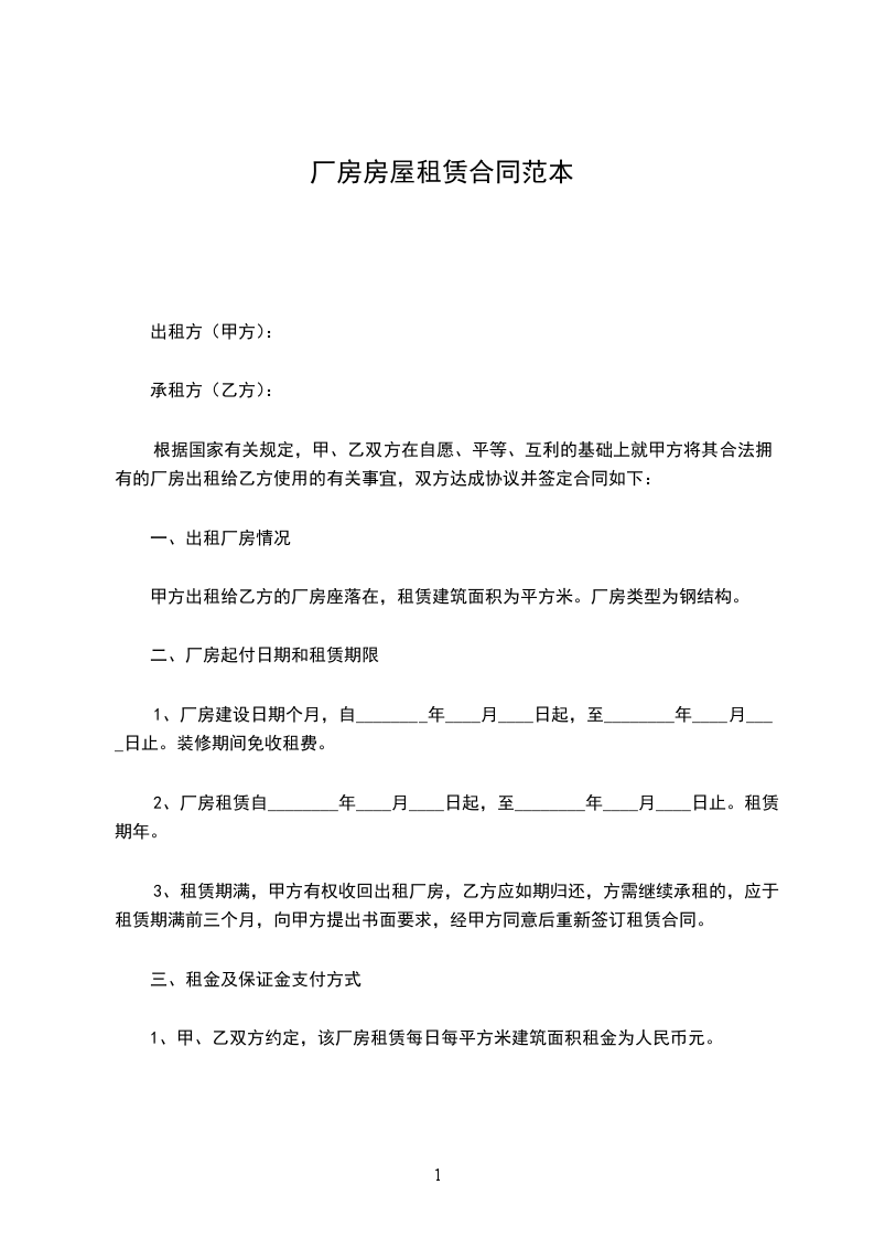 1、甲、乙双方约定,该厂房租赁每日每平方米建筑面积租金为人民币_____元。