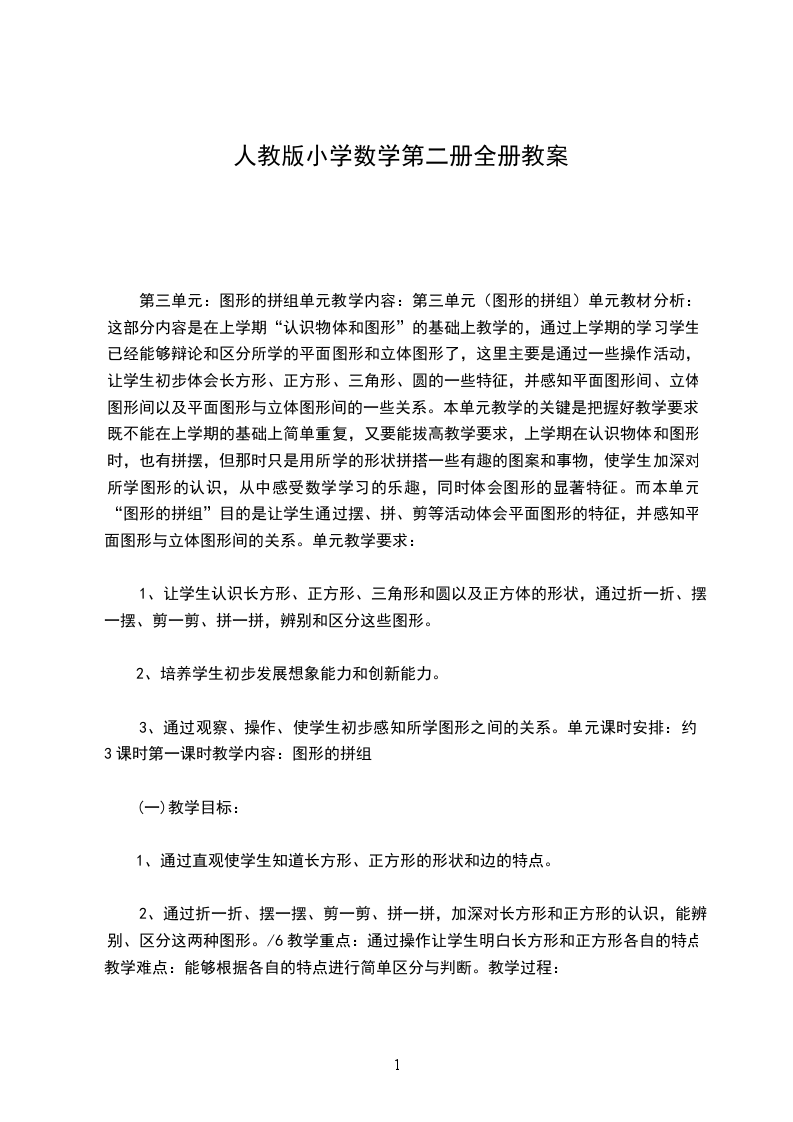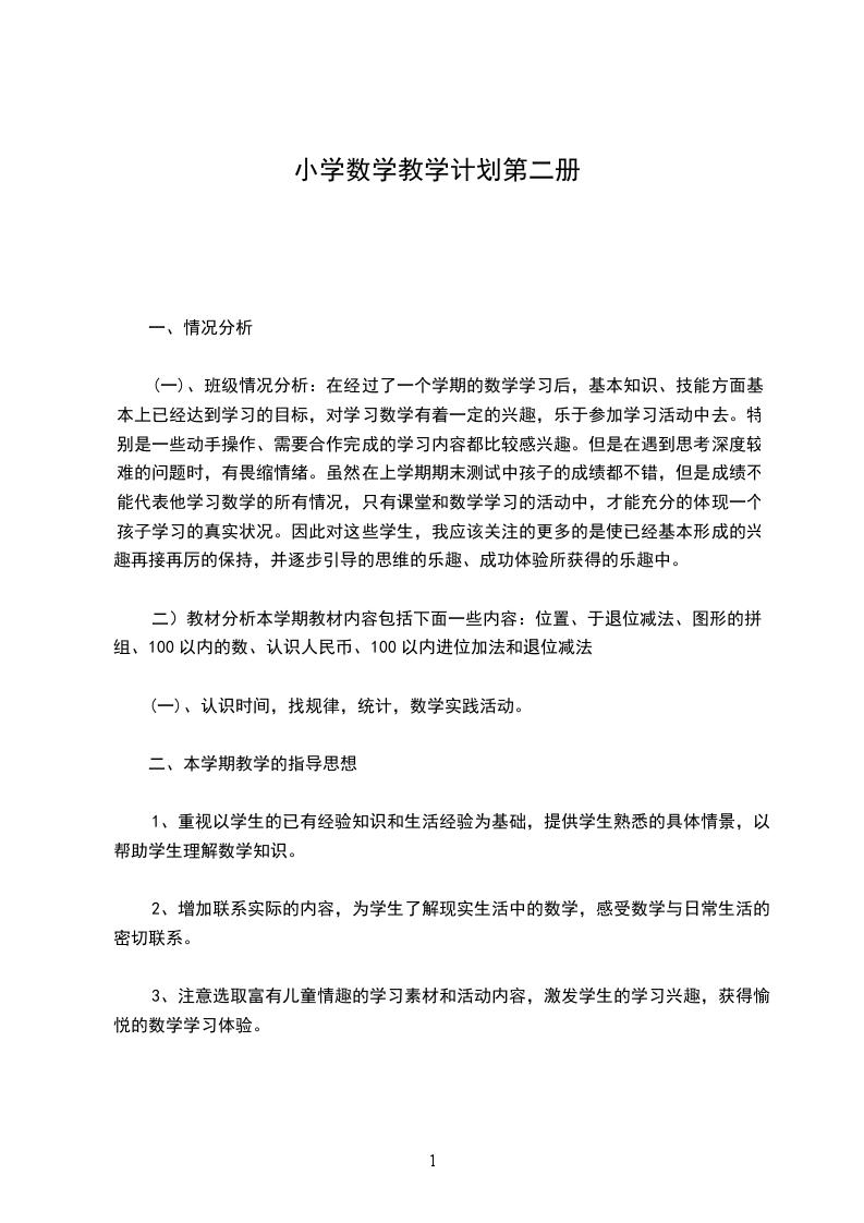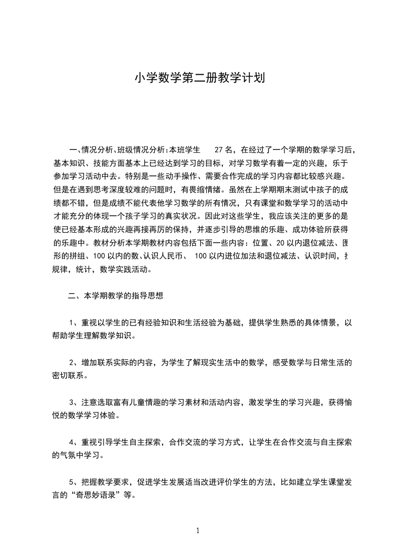 一、情况分析、班级情况分析:本班学生27名,在经过了一个学期的数学学习后,基本知识、技能方面基本上已经达到学习的目标,对学习数学有着一定的兴趣,乐于参加学习活动中去。特别是一些动手操作、需要合作完成的学习内容都比较感兴趣。但是在遇到思考深度较难的问题时,有畏缩情绪。虽然在上学期期末测试中孩子的成绩都不错,但是成绩不能代表他学习数学的所有情况,只有课堂和数学学习的活动中,才能充分的体现一个孩子学习的真实状况。因此对这些学生,我应该关注的更多的是使已经基本形成的兴趣再接再厉的保持,并逐步引导的思维的乐趣、成功体验所获得的乐趣中。教材分析本学期教材内容包括下面一些内容:位置、20以内退位减法、图形的拼组、100以内的数、认识人民币、100以内进位加法和退位减法、认识时间,找规律,统计,数学实践活动。