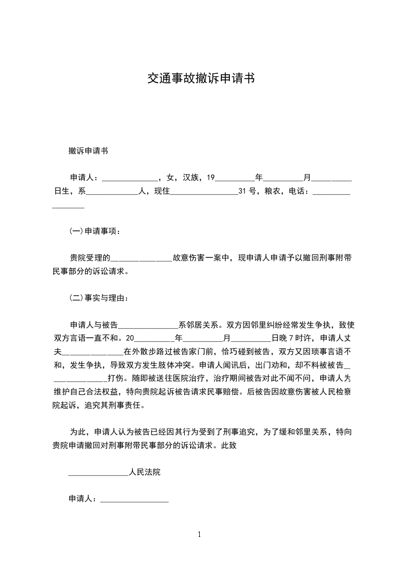 贵院受理的_______________故意伤害一案中,现申请人申请予以撤回刑事附带民事部分的诉讼请求。