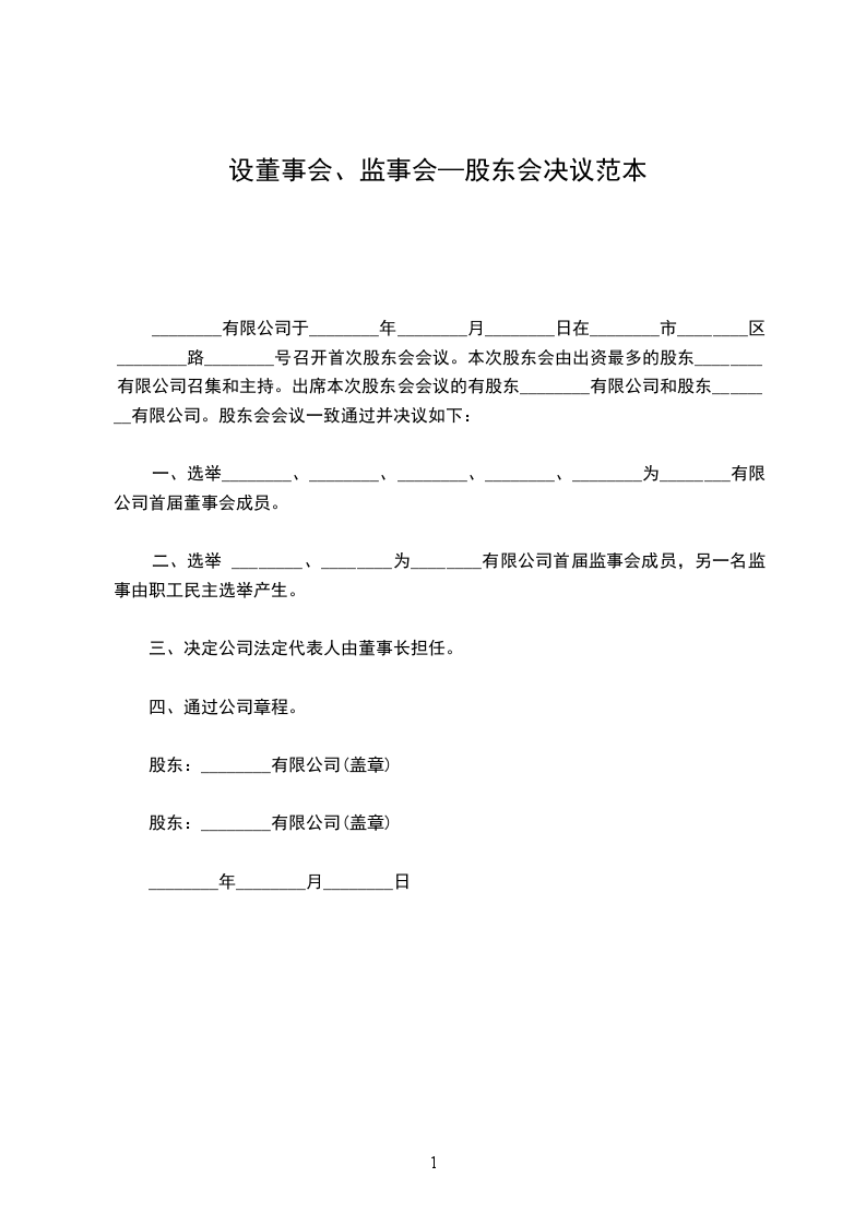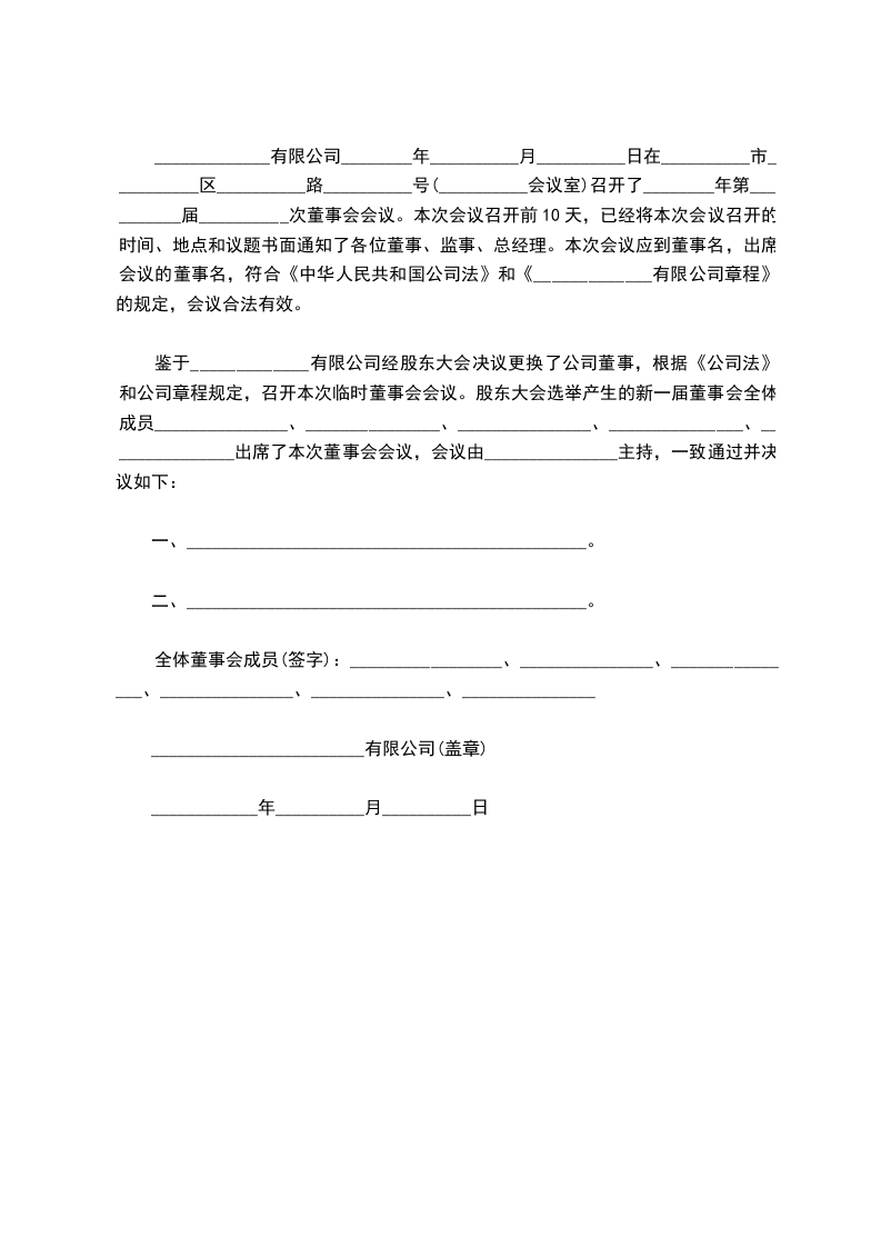 鉴于__________有限公司经股东大会决议更换了公司董事,根据《公司法》和公司章程规定,召开本次临时董事会会议。股东大会选举产生的新一届董事会全体成员_______________、_______________、_______________、_______________、_______________出席了本次董事会会议,会议由_______________主持,一致通过并决议如下:_________________