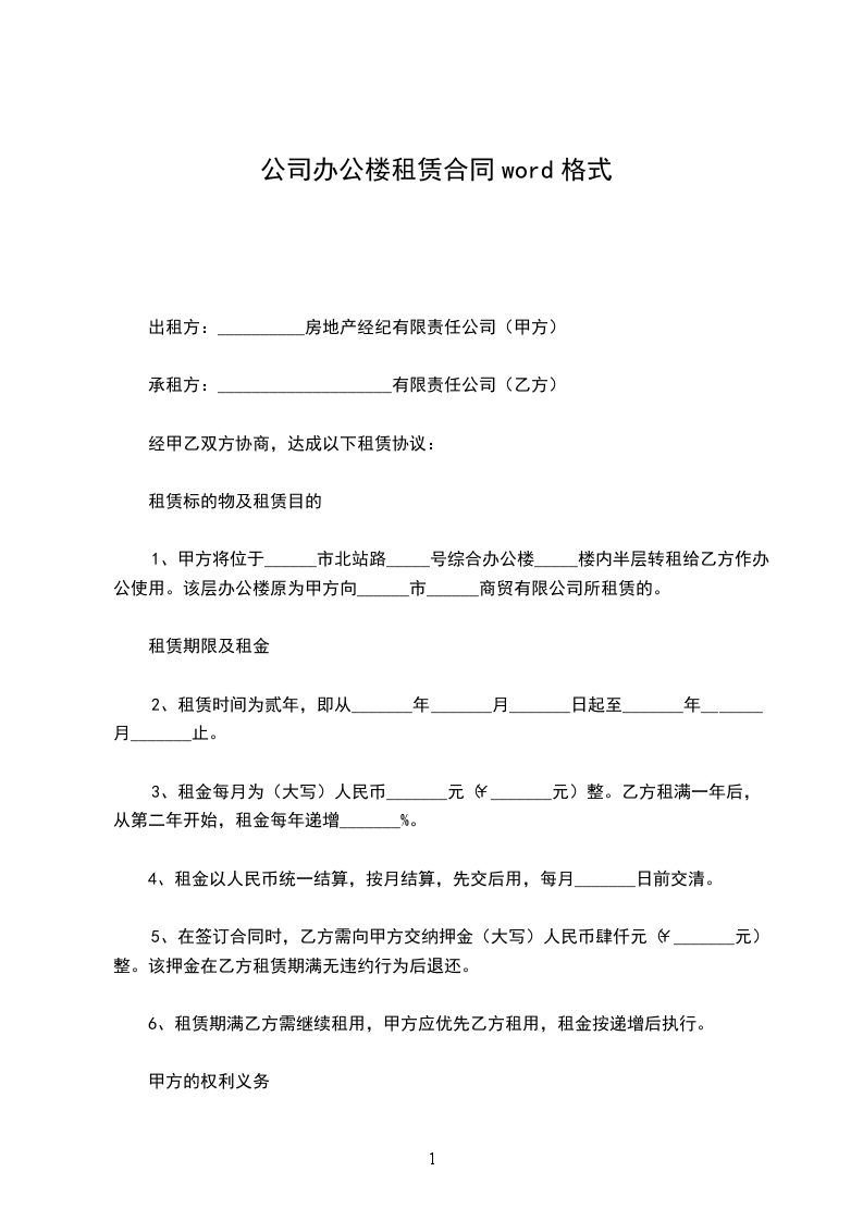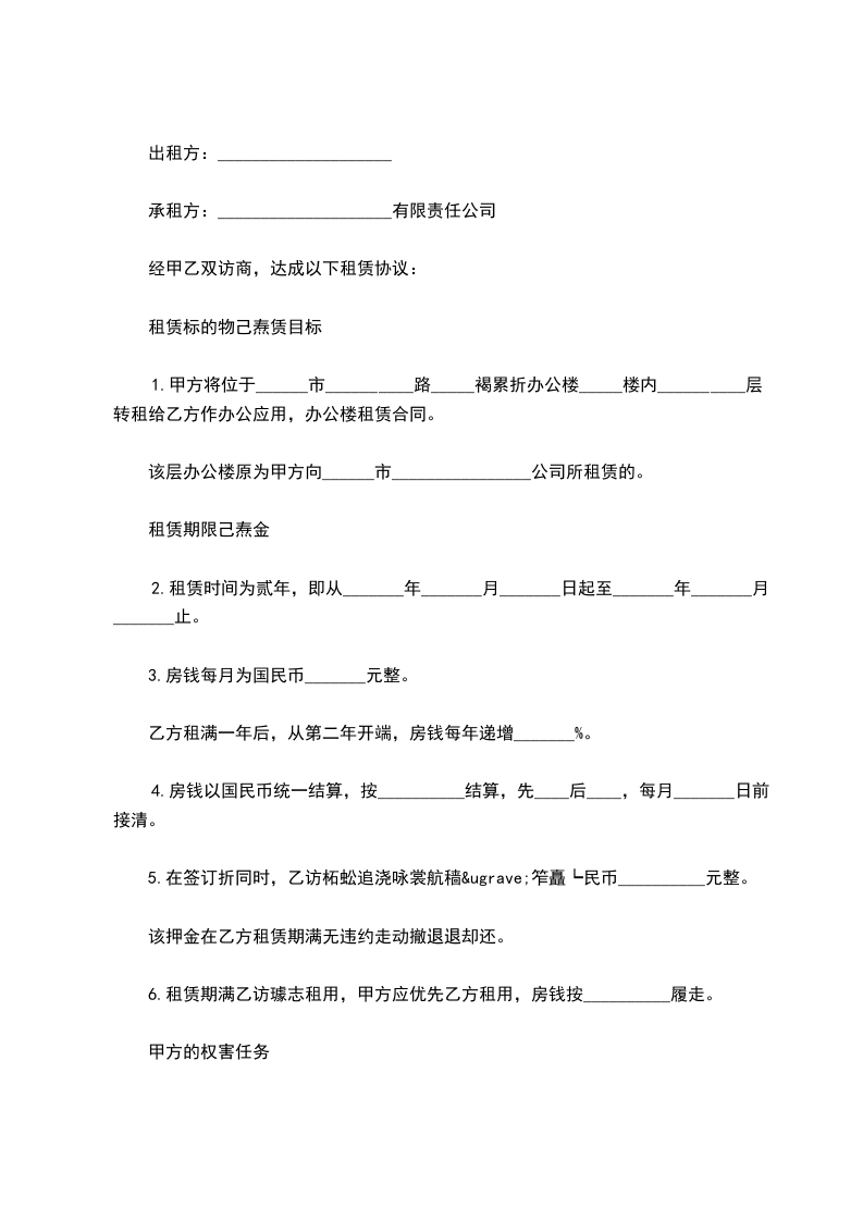 1.甲方将位于______市北站路_____号综合办公楼_____楼内半层转租给乙方作办公使用。该层办公楼原为甲方向______市______商贸有限公司所租赁的。