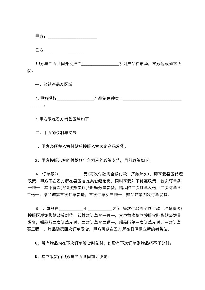 B,订单额在____________至____________之间(每次付款需全额付款,严禁赊欠)按照区域销售站政策对待,即首次订单买一赠一,其中首次货物按照实际货款额数量发货,赠品随二次订单发送,二次订单买二送一,赠品随第三次订单发送,三次订单买三赠一,赠品随第四次订单发货。甲方可以在乙方所在县区建立新的销售站。