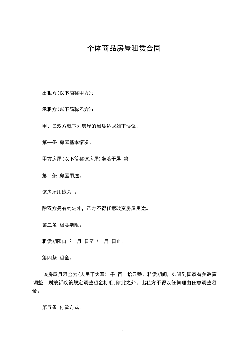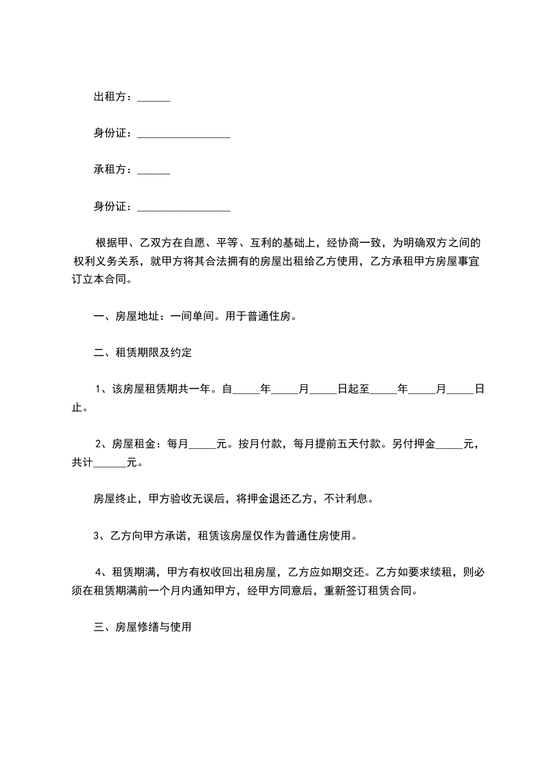 1、该房屋租赁期共一年。自________年____月____日起至________年____月____日止。