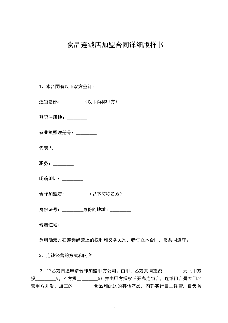 2.1?乙方自愿申请合作加盟甲方公司,由甲、乙方共同投资_________元(甲方投_________%,乙方投_________%)并由甲方授权后开办连锁店,连锁门店是专门经营甲方开发、加工的_________食品和配送的其他产品,内部实行自主经营,自负盈亏,_____核算。连锁企业名称:_________(以下简称连锁门店)经营地址:_________