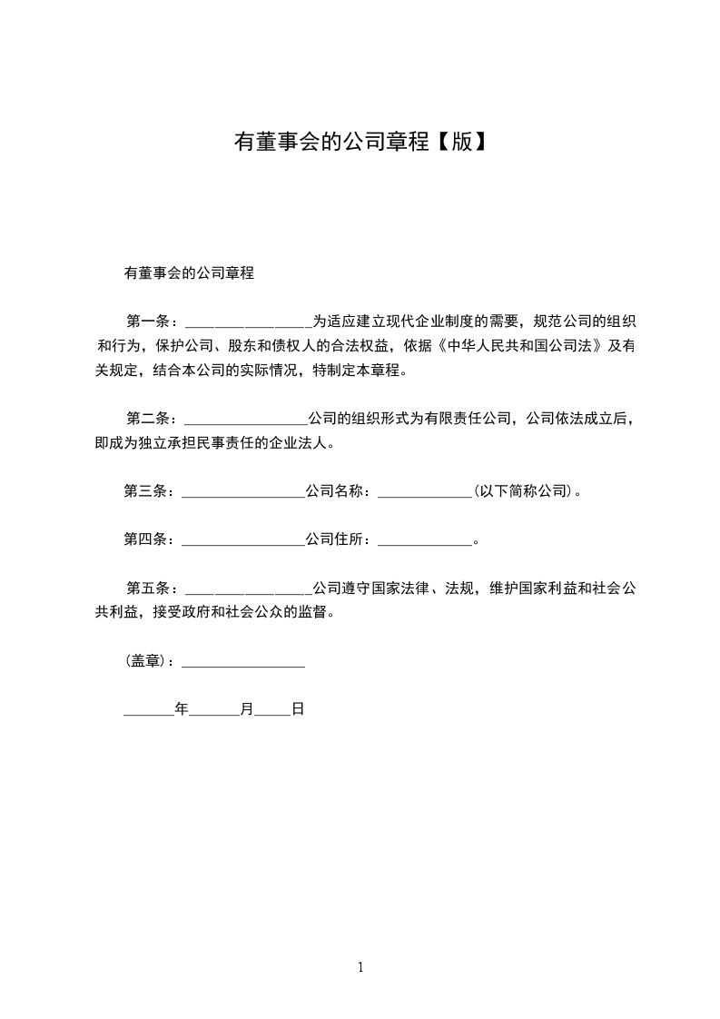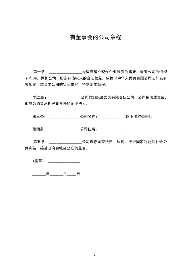 第一条:_________________为适应建立现代企业制度的需要,规范公司的组织和行为,保护公司、股东和债权人的合法权益,依据《中华人民共和国公司法》及有关规定,结合本公司的实际情况,特制定本章程。