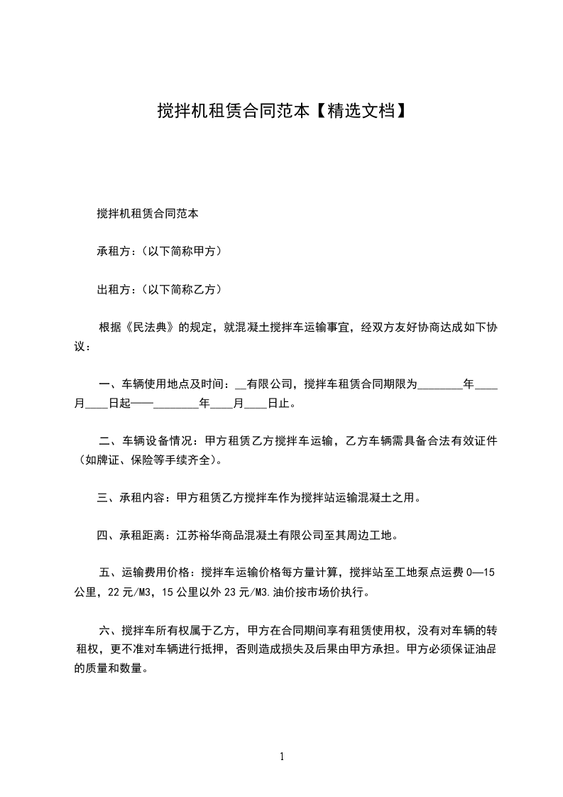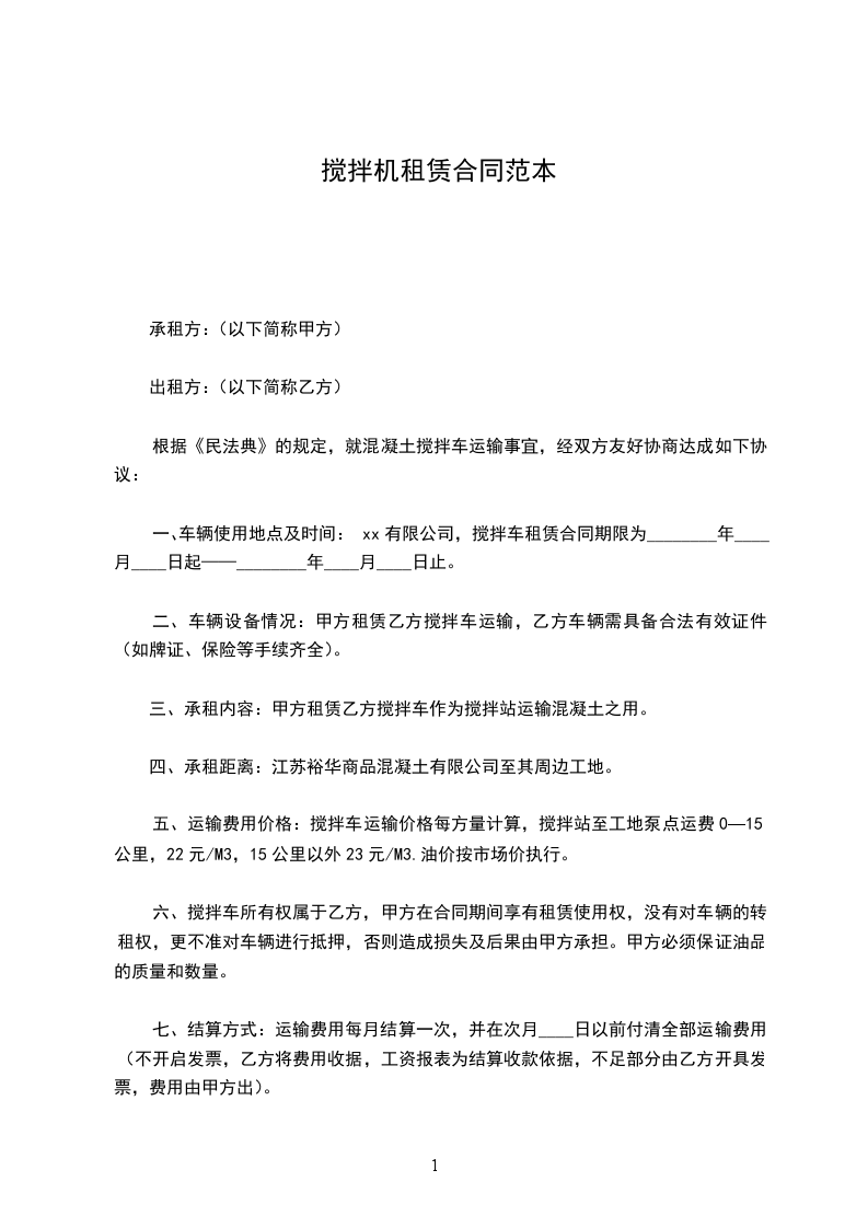 根据《民法典》的规定,就混凝土搅拌车运输事宜,经双方友好协商达成如下协议: