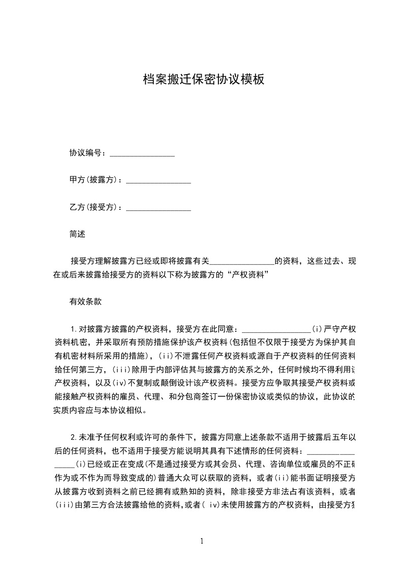 1.对披露方披露的产权资料,接受方在此同意:_________________(i)严守产权资料机密,并采取所有预防措施保护该产权资料(包括但不仅限于接受方为保护其自有机密材料所采用的措施),(ii)不泄露任何产权资料或源自于产权资料的任何资料给任何第三方,(iii)除用于内部评估其与披露方的关系之外,任何时候均不得利用该产权资料,以及(iv)不复制或颠倒设计该产权资料。接受方应争取其接受产权资料或能接触产权资料的雇员、代理、和分包商签订一份保密协议或类似的协议,此协议的实质内容应与本协议相似。