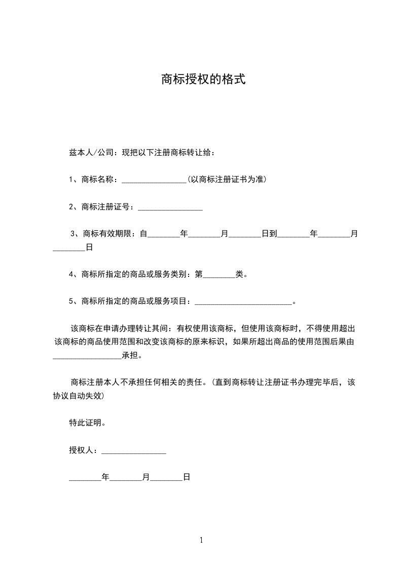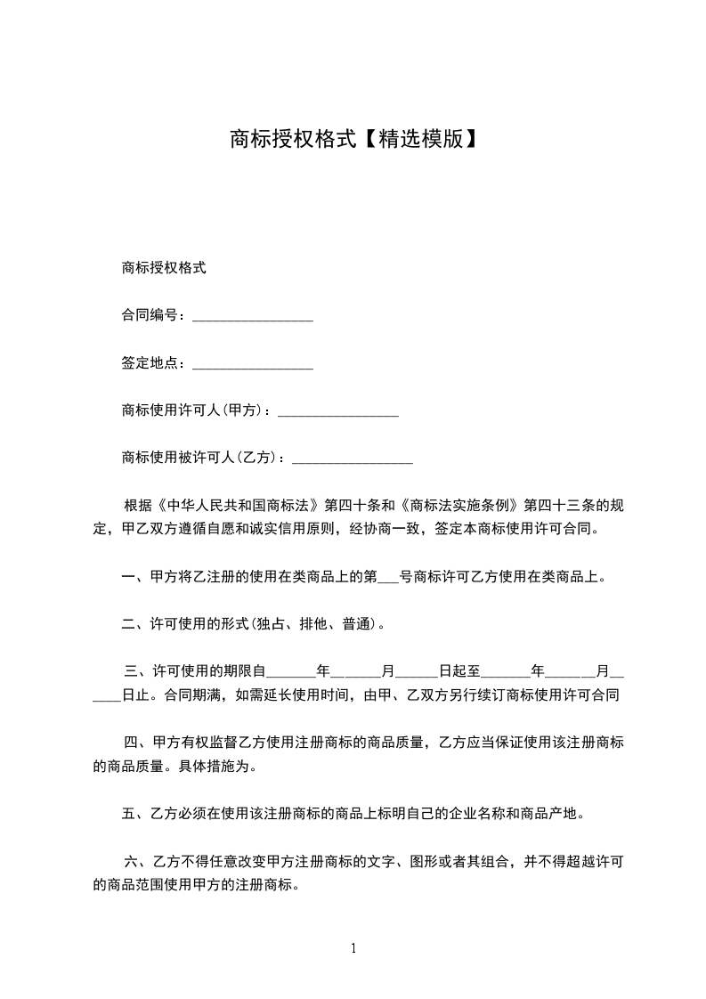 一、甲方将乙注册的使用在类商品上的第号商标许可乙方使用在类商品上。