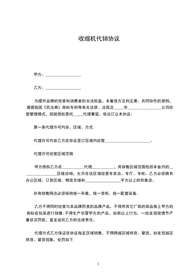 1.甲方授权乙方在规定的销售区域经销_________________品牌专卖、专厅、专柜的产。
