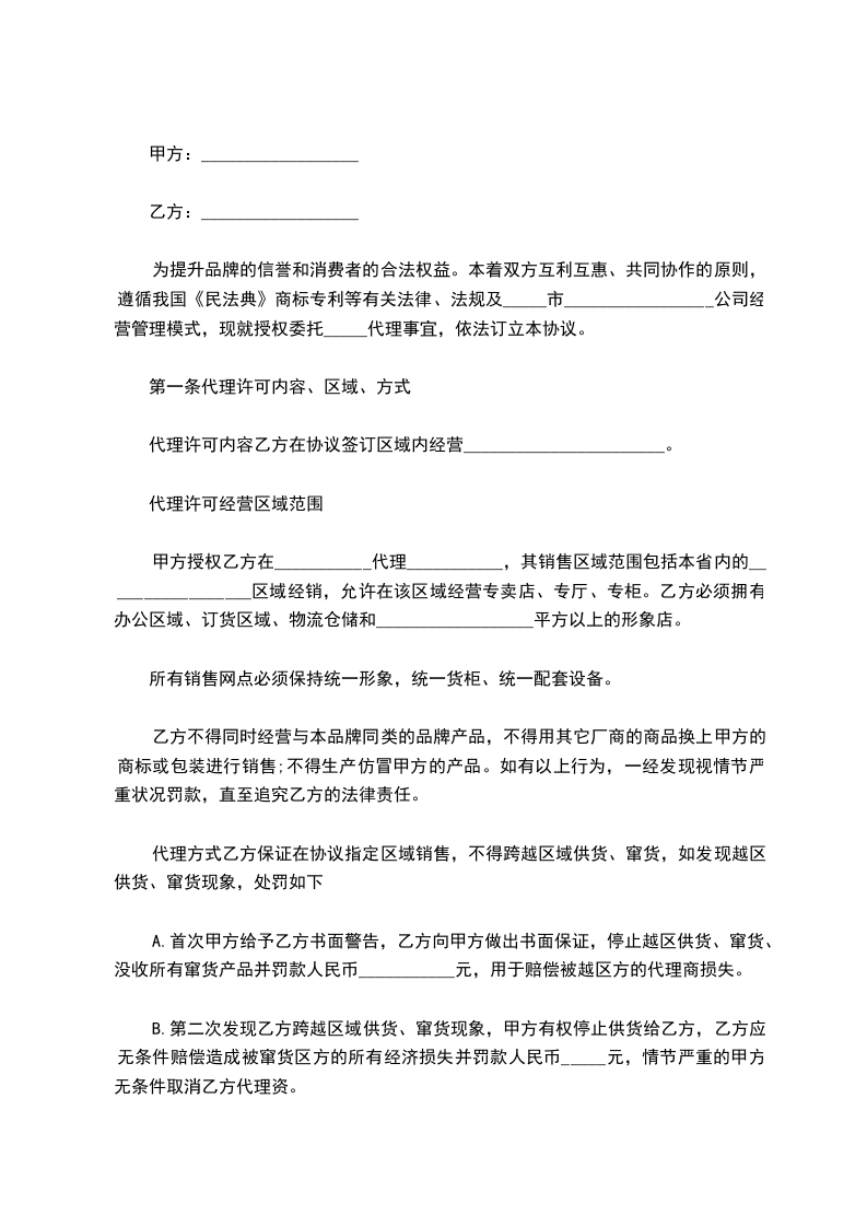 1、甲方授权乙方为线上总代理,包括但不限于________________________________________________________等电商平台。甲方以及甲方不能授权其他公司从事电商业务。如有其他公司从事电商业务,需经乙方同意并从乙方进货,供货价格由乙方制定。甲方需提供品牌授权予乙方(以具体品牌授权书的形式,独家代理形式授予乙方)授权期限为_______年,_______年___月___日至_______年___月___日。