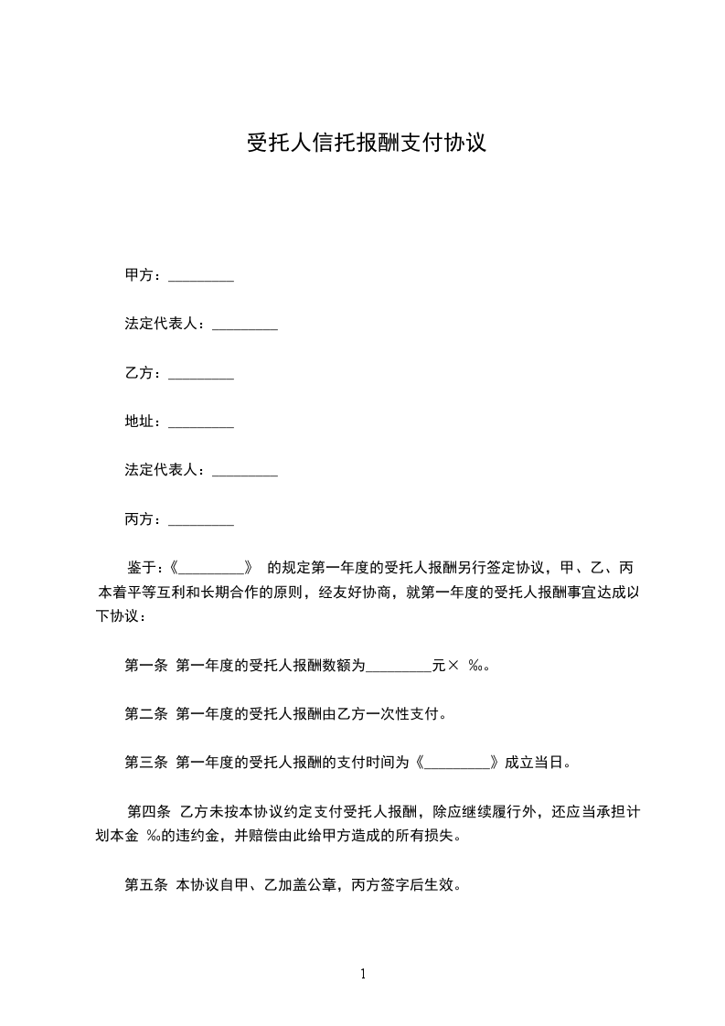 鉴于:《_________》(附件二)的规定第一年度的受托人报酬另行签定协议,甲、乙、丙本着平等互利和长期合作的原则,经友好协商,就第一年度的受托人报酬事宜达成以下协议: