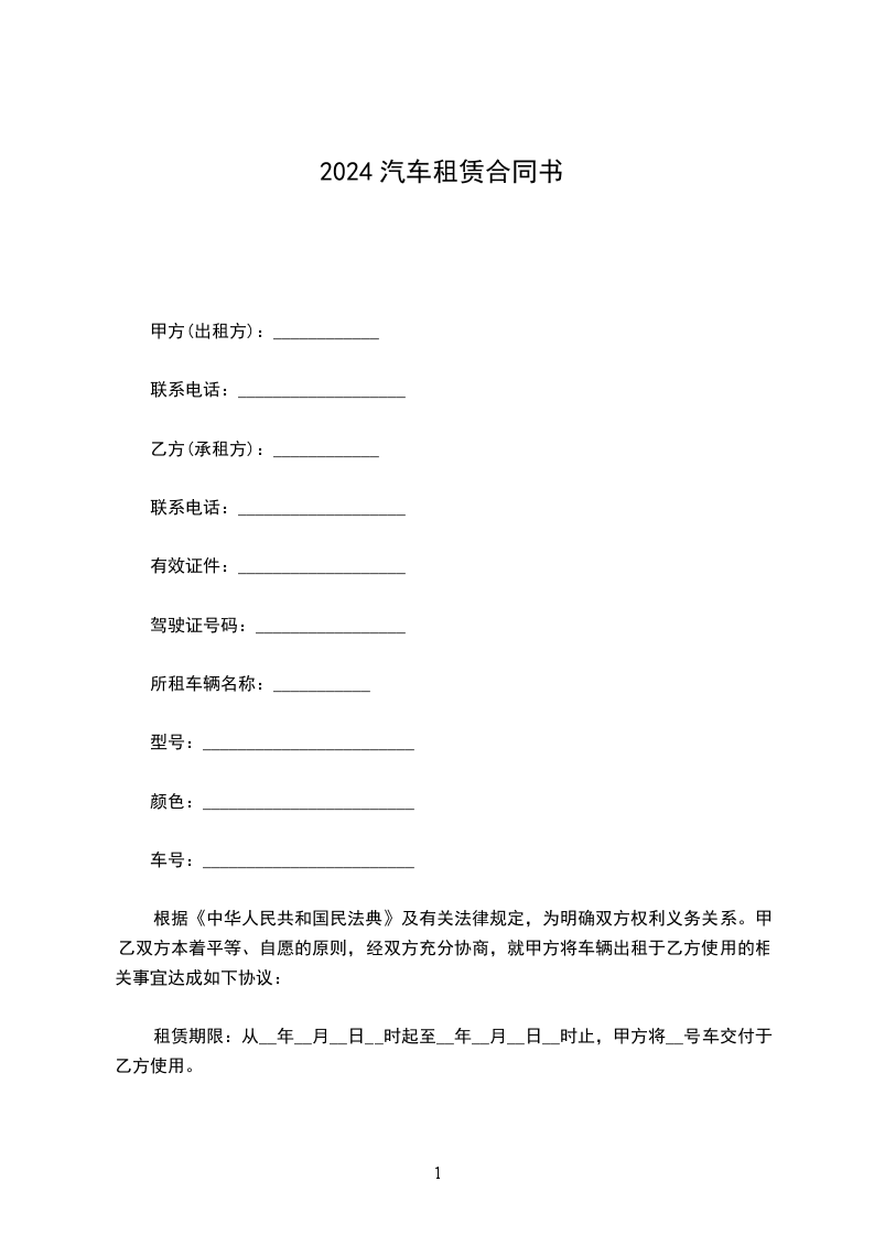 4、租车时间为________天,自________年____月____日_____时至________年____月____日______时止。
