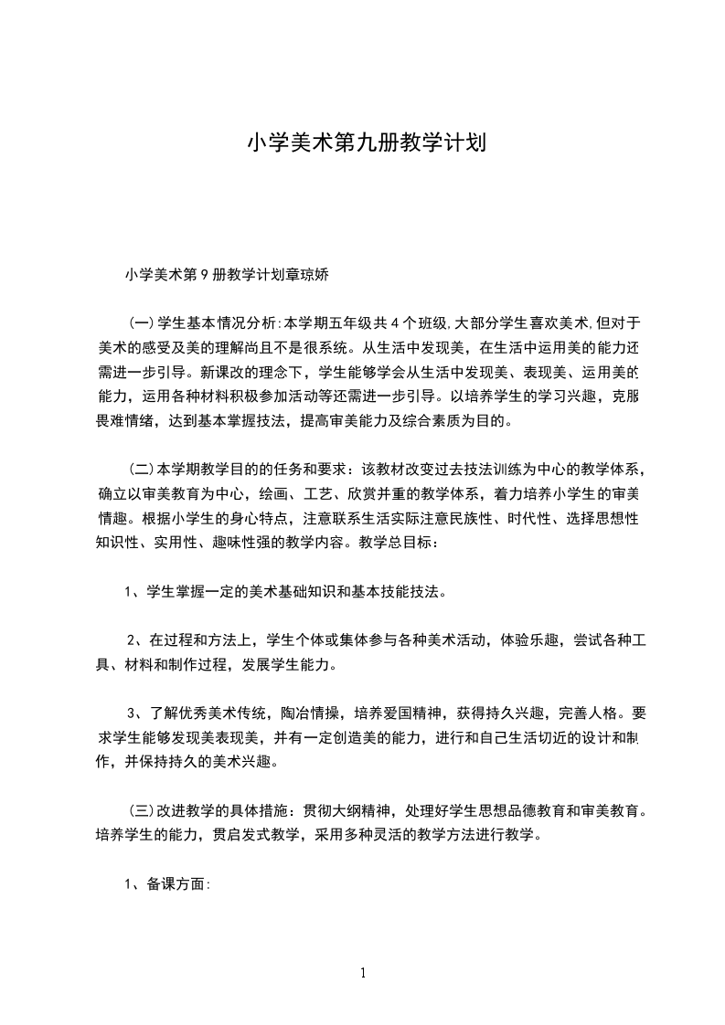 小学美术第9册教学计划章琼娇