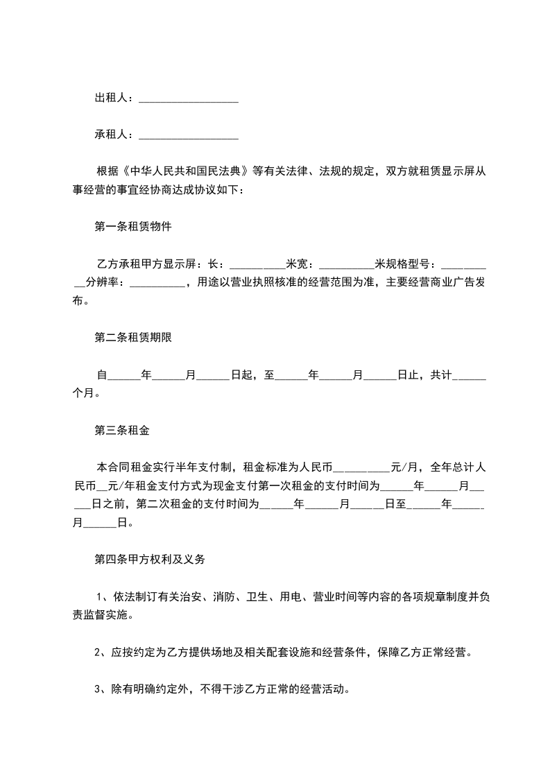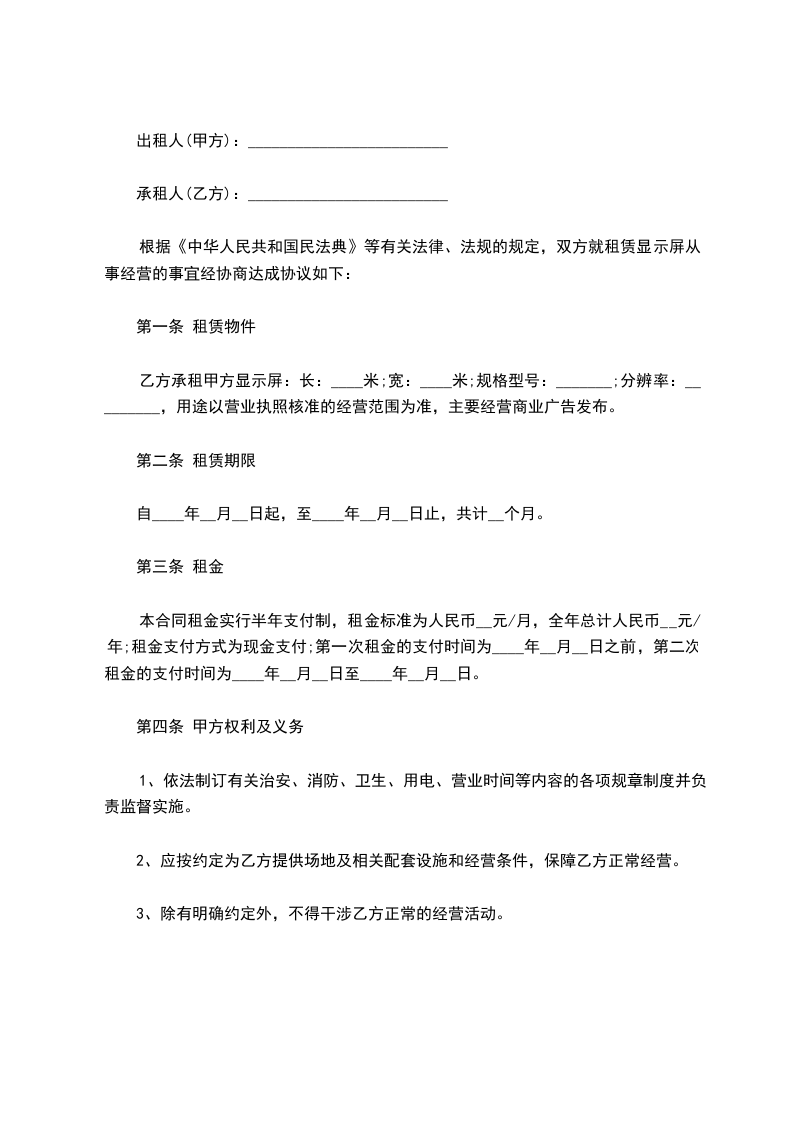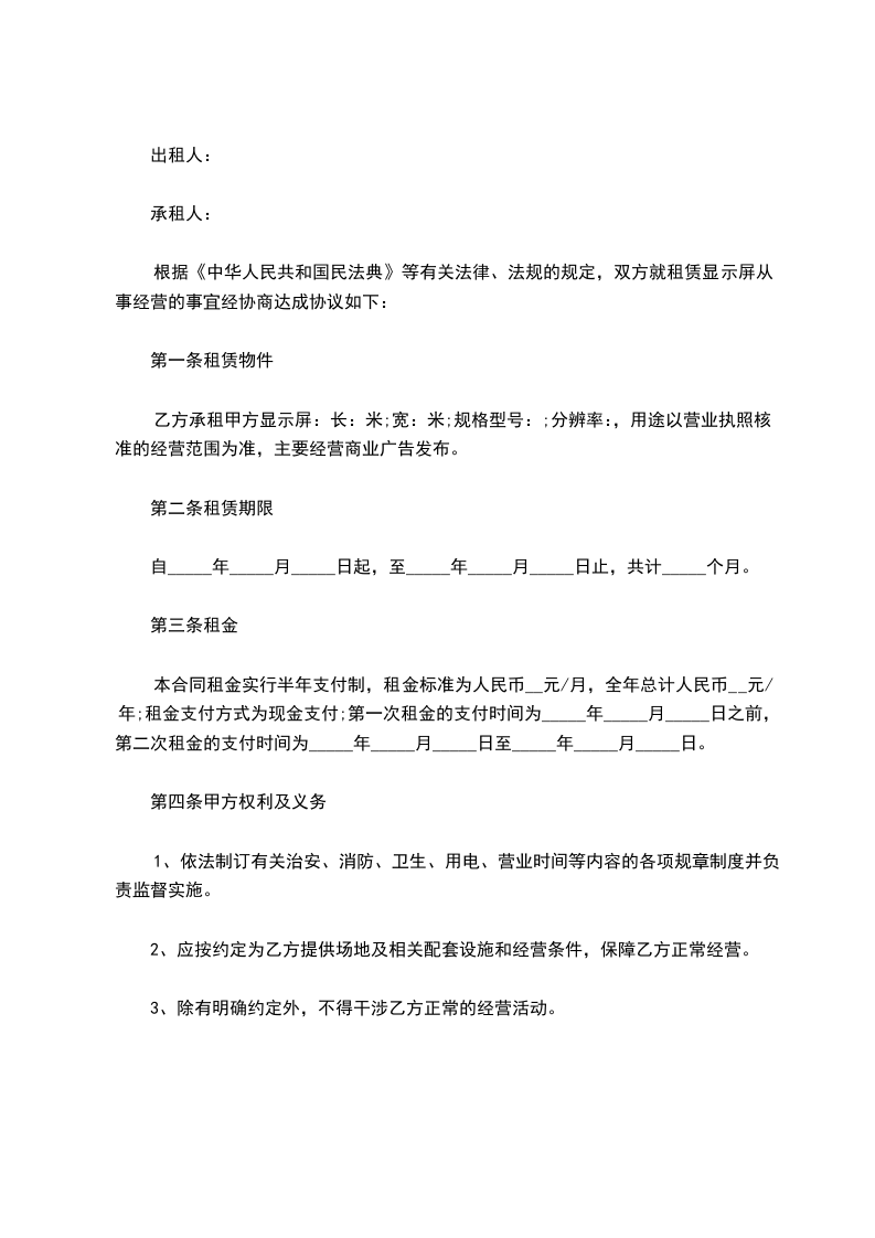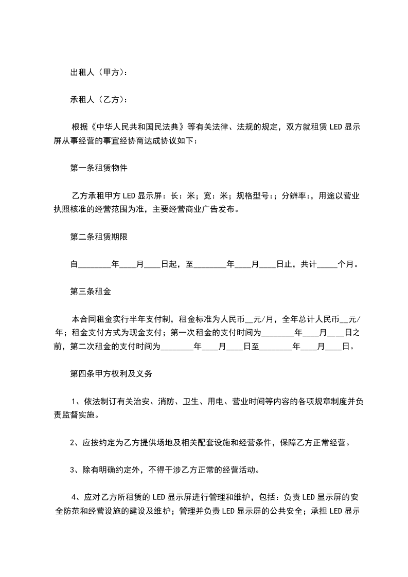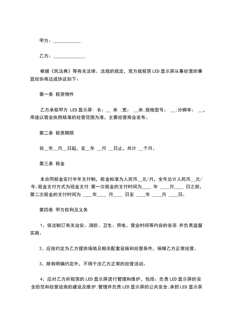 根据《中华人民共和国民法典》等有关法律、法规的规定,双方就租赁LED显示屏从事经营的事宜经协商达成协议如下: