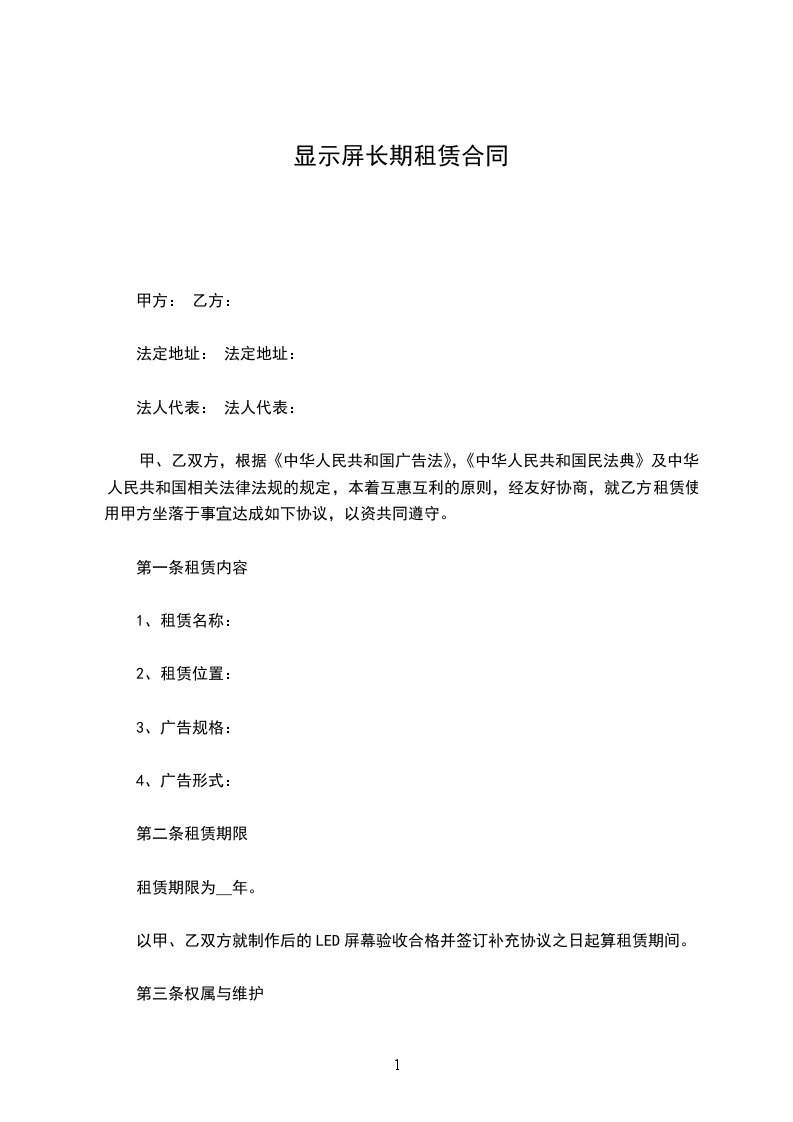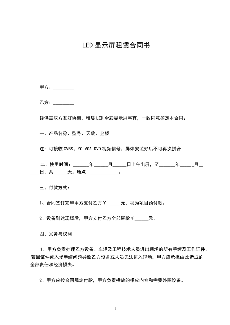 乙方承租甲方LED显示屏:长:米;宽:米;规格型号:;分辨率:,用途以营业执照核准的经营范围为准,主要经营商业广告发布。