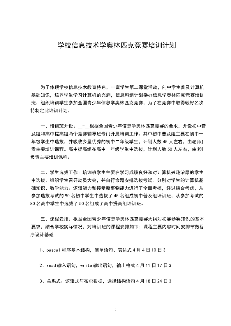 为了体现学校信息技术教育特色,丰富学生第二课堂活动,向中学生普及计算机基础知识,培养学生学习计算机的兴趣,信息科组计划举办信息学奥林匹克竞赛培训班,组织培训学生参加全国青少年信息学奥林匹克竞赛,为了在竞赛中取得较好名次,特制定此培训计划。