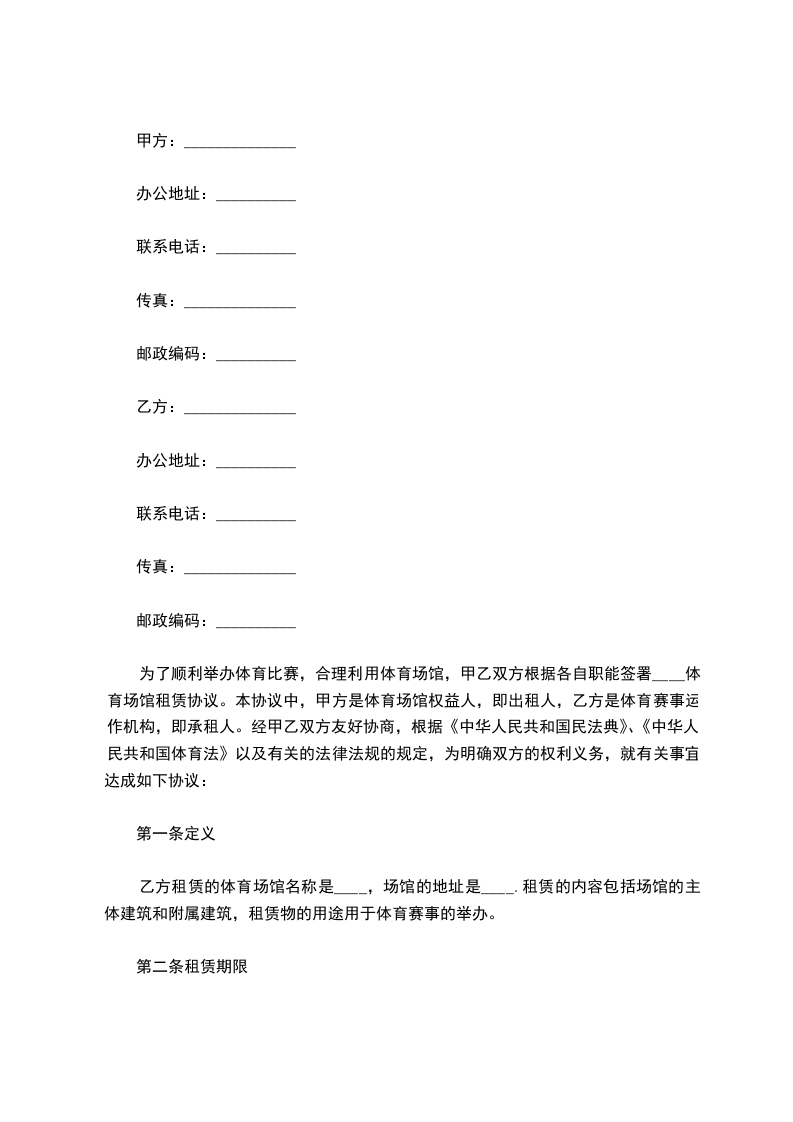为了顺利举办体育比赛,合理利用体育场馆,甲乙双方根据各自职能签署____体育场馆租赁协议。本协议中,甲方是体育场馆权益人,即出租人,乙方是体育赛事运作机构,即承租人。经甲乙双方友好协商,根据《中华人民共和国民法典》、《中华人民共和国体育法》以及有关的法律法规的规定,为明确双方的权利义务,就有关事宜达成如下协议:
