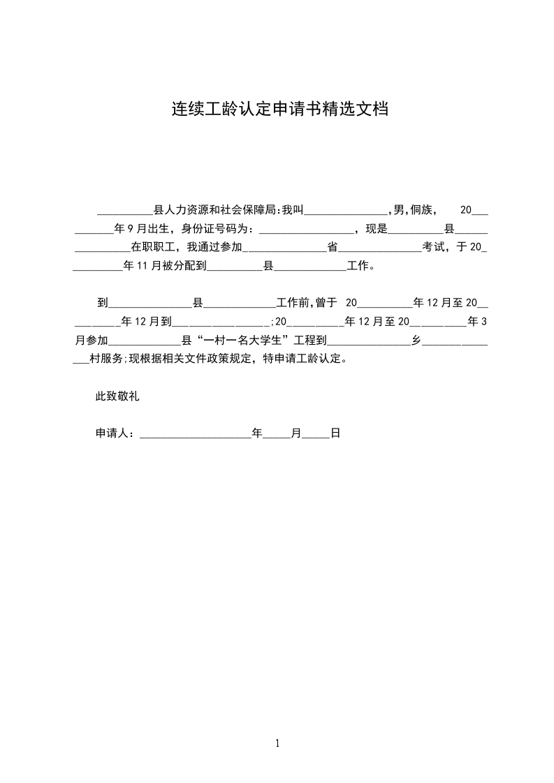 到_______________县_____________工作前,曾于20__________年12月至20__________年12月到_________________;20__________年12月至20__________年3月参加_____________县“一村一名大学生”工程到_______________乡_______________村服务;现根据相关文件政策规定,特申请工龄认定。