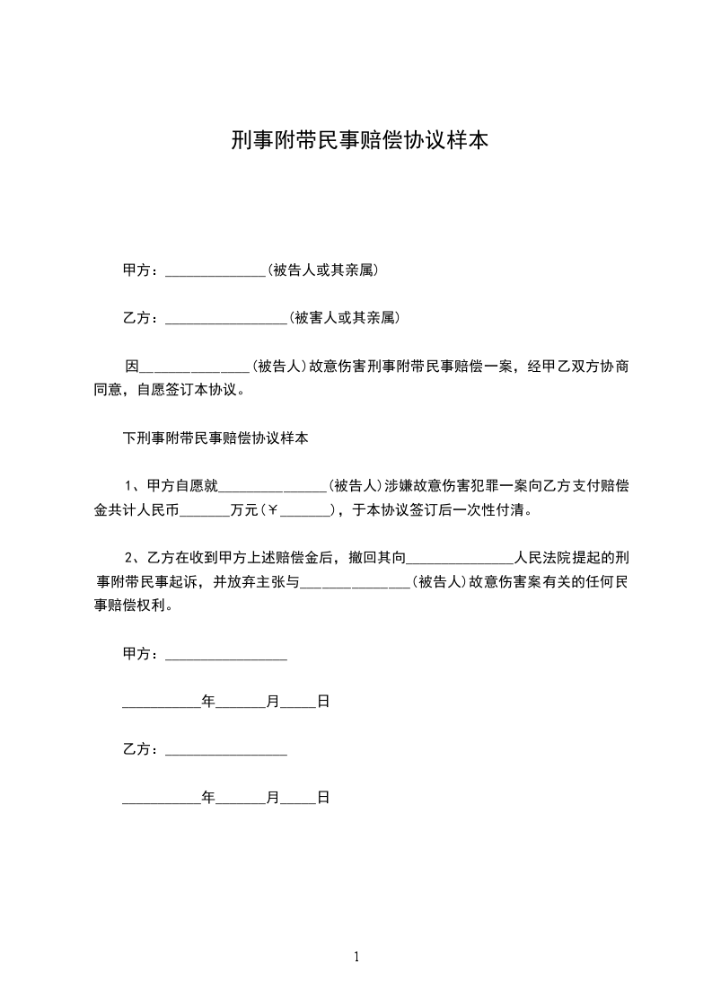 1、甲方自愿就_______________(被告人)涉嫌故意伤害犯罪一案向乙方支付赔偿金共计人民币_______万元(¥_______),于本协议签订后一次性付清。