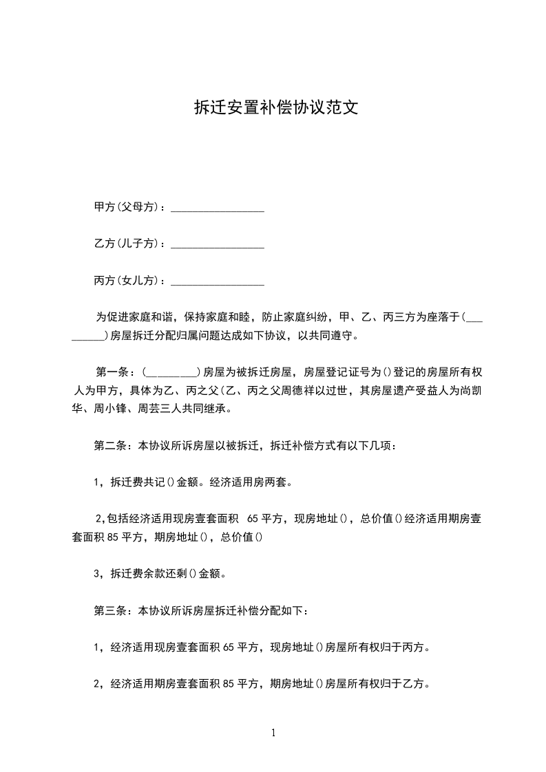 为促进家庭和谐,保持家庭和睦,防止家庭纠纷,甲、乙、丙三方为座落于(_________)房屋拆迁分配归属问题达成如下协议,以共同遵守。