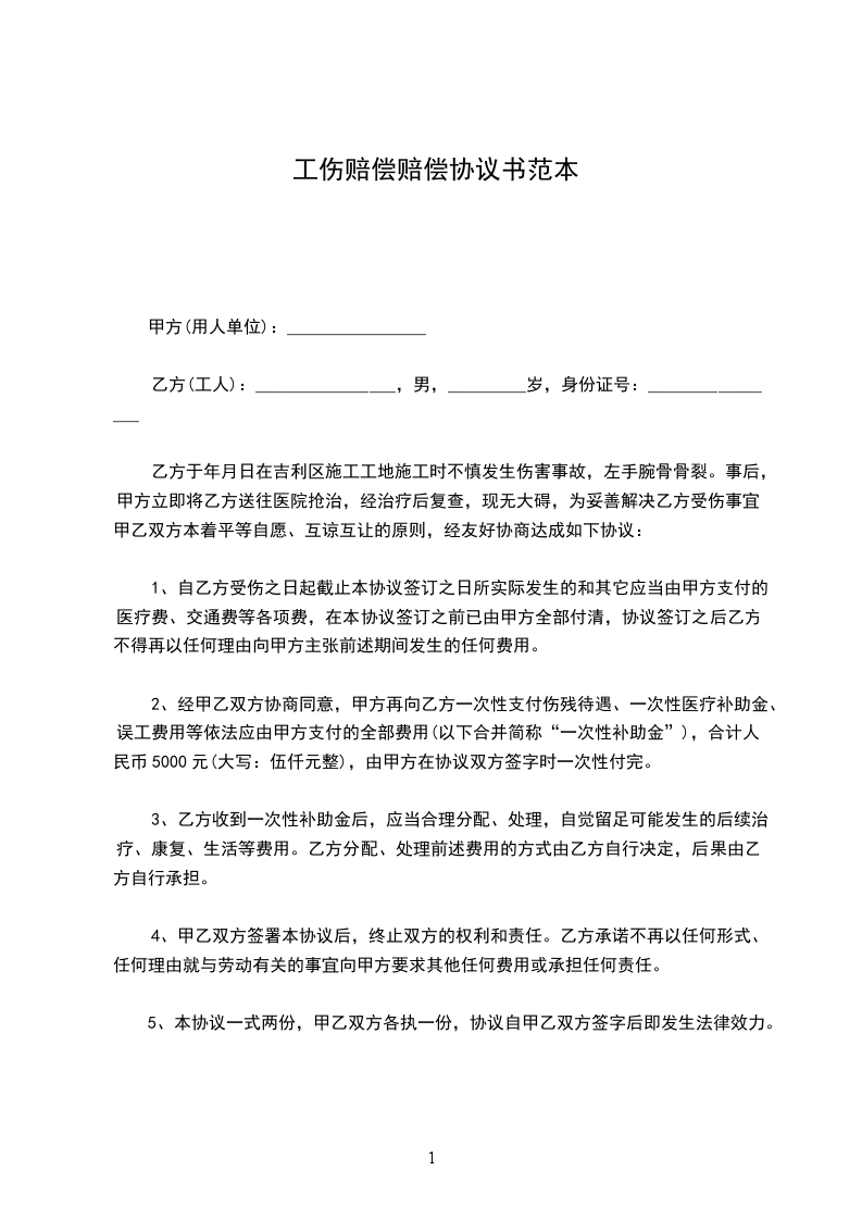 2、经甲乙双方协商同意,甲方再向乙方一次性支付伤残待遇、一次性医疗补助金、误工费用等依法应由甲方支付的全部费用(以下合并简称“一次性补助金”),合计人民币5000元(大写:伍仟元整),由甲方在协议双方签字时一次性付完。