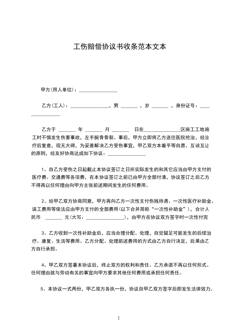 乙方于 _______ 年 _______ 月 _______ 日在_______________区施工工地施工时不慎发生伤害事故,左手腕骨骨裂。事后,甲方立即将乙方送往医院抢治,经治疗后复查,现无大碍,为妥善解决乙方受伤事宜,甲乙双方本着平等自愿、互谅互让的原则,经友好协商达成如下协议:________________