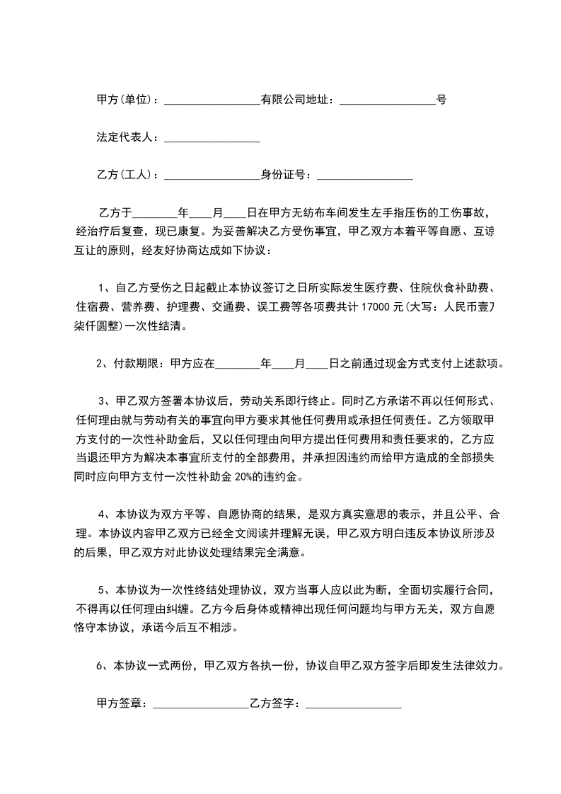 1、自乙方受伤之日起截止本协议签订之日所实际发生医疗费、住院伙食补助费、住宿费、营养费、护理费、交通费、误工费等各项费共计17000元(大写:人民币壹万柒仟圆整)一次性结清。