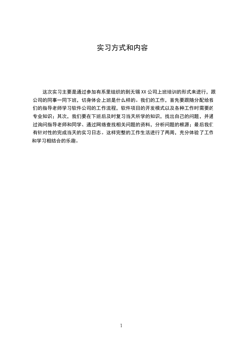 这次实习主要是通过参加有系里组织的到无锡XX公司上班培训的形式来进行,跟公司的同事一同下班,切身体会上班是什么样的。我们的工作,首先要跟随分配给我们的指导老师学习软件公司的工作流程,软件项目的开发模式以及各种工作时需要的专业知识;其次,我们要在下班后及时复习当天所学的知识,找出自己的问题,并通过询问指导老师和同学、通过网络查找相关问题的资料,分析问题的根源;最后我们有针对性的完成当天的实习日志。这样完整的工作生活进行了两周,充分体验了工作和学习相结合的乐趣。