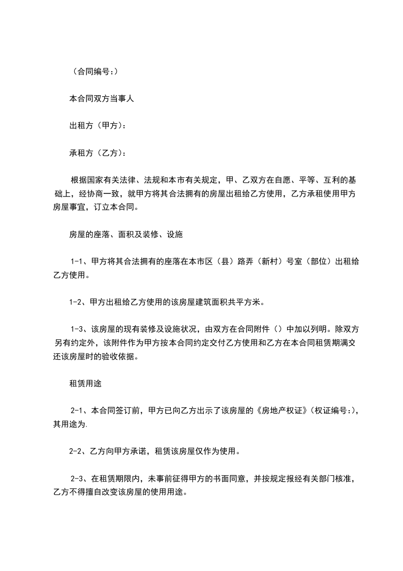 根据国家有关法律、法规和本市有关规定,甲、乙双方在自愿、平等、互利的基础上,经协商一致,就甲方将其合法拥有的房屋出租给乙方使用,乙方承租使用甲方房屋事宜,订立本合同。