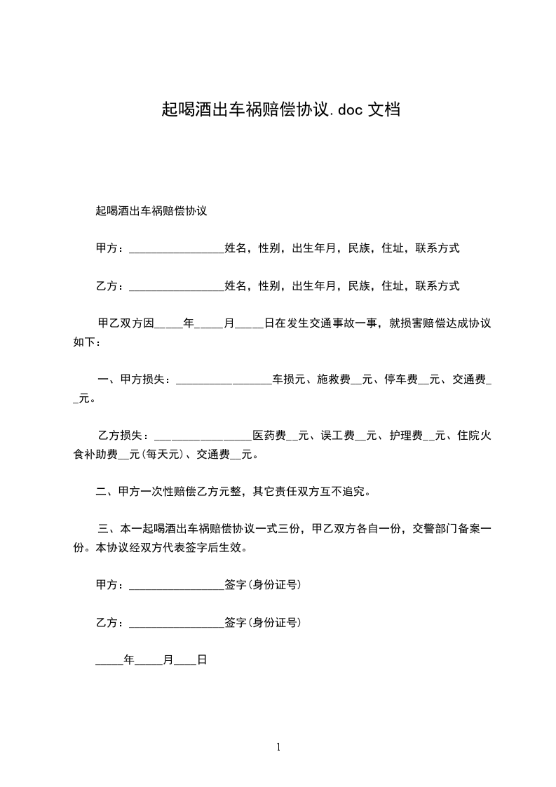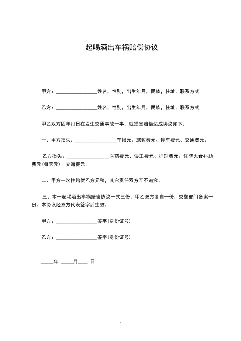 三、本一起喝酒出车祸赔偿协议一式三份,甲乙双方各自一份,交警部门备案一份。本协议经双方代表签字后生效。