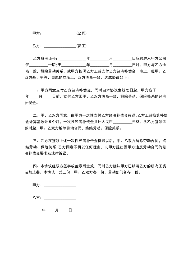 二、甲、乙双方同意,由甲方一次性支付乙方经济补偿金待遇;乙方工龄换算补偿金计算基数计5个月,一次性经济补偿金共计人民币__________元整,从乙方签领该款时起,甲、乙双方解除劳动合同,终结劳动、保险关系。