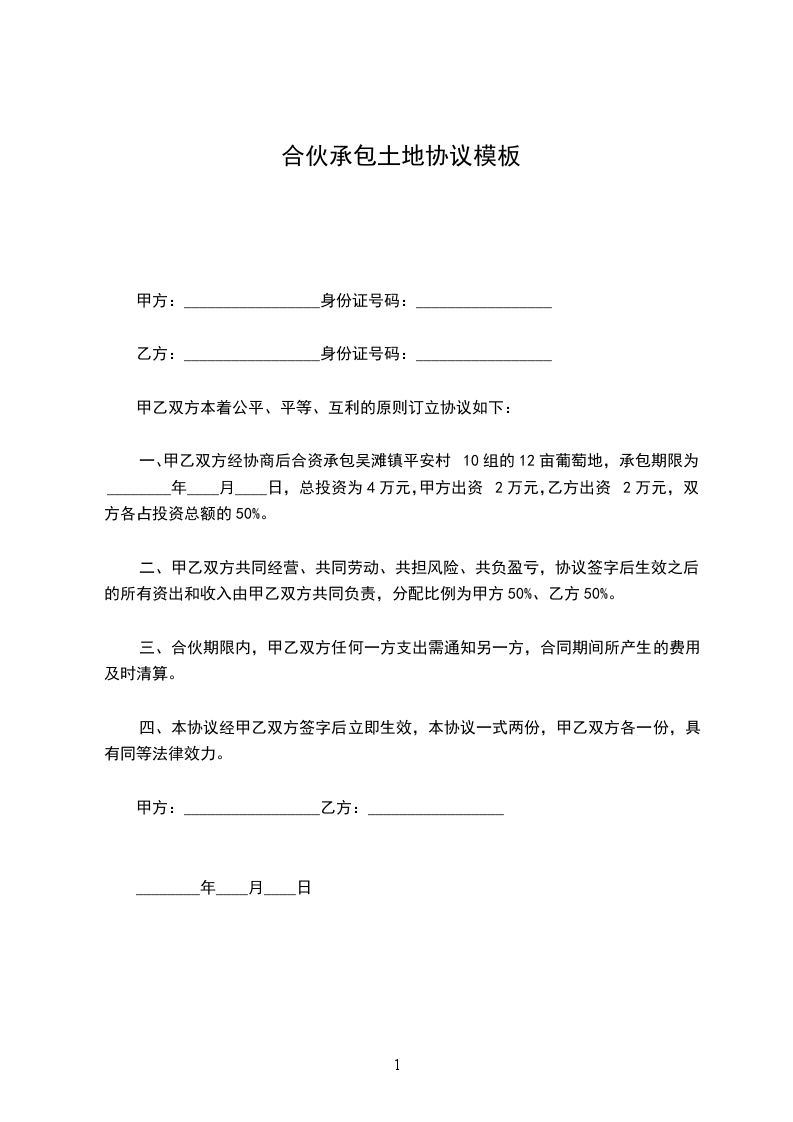一、甲乙双方经协商后合资承包吴滩镇平安村10组的12亩葡萄地,承包期限为________年____月____日,总投资为4万元,甲方出资2万元,乙方出资2万元,双方各占投资总额的50%。