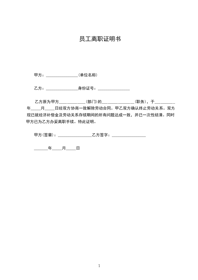 乙方原为甲方_____________(部门)的________________(职务),于__________年_____月_____日经双方协商一致解除劳动合同。甲乙双方确认终止劳动关系。双方现已就经济补偿金及劳动关系存续期间的所有问题达成一致,并已一次性结清。同时,甲方已为乙方办妥离职手续。特此证明。