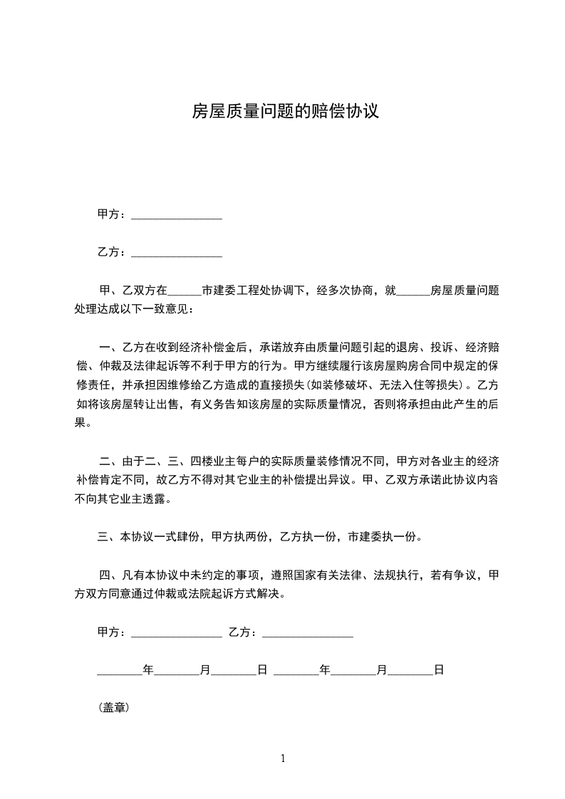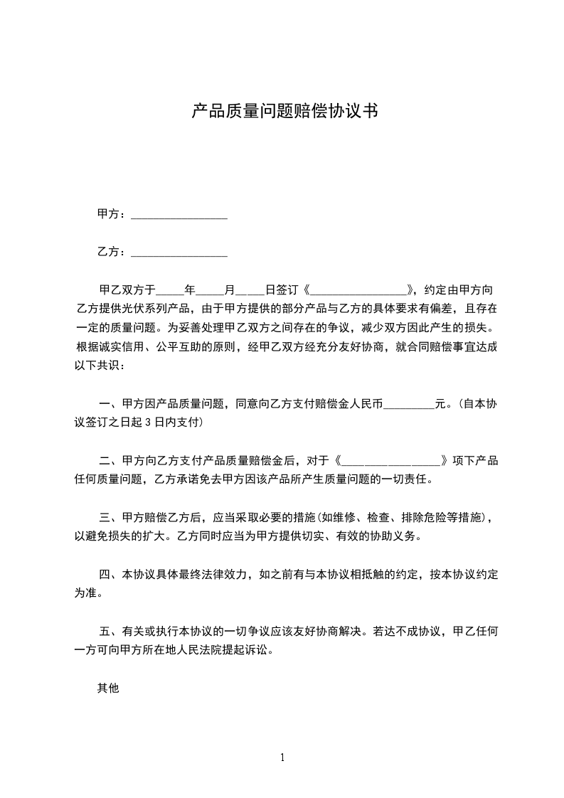 一、甲方因产品质量问题,同意向乙方支付赔偿金人民币_________元。(自本协议签订之日起3日内支付)