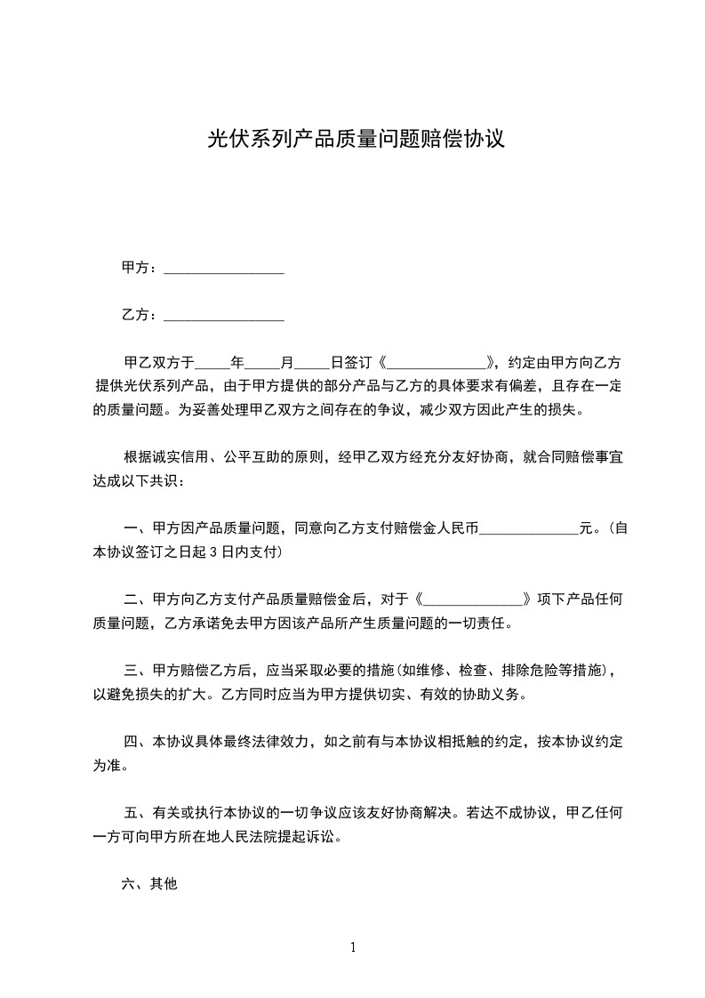甲乙双方于_____年_____月_____日签订《_________________》,约定由甲方向乙方提供光伏系列产品,由于甲方提供的部分产品与乙方的具体要求有偏差,且存在一定的质量问题。为妥善处理甲乙双方之间存在的争议,减少双方因此产生的损失。根据诚实信用、公平互助的原则,经甲乙双方经充分友好协商,就合同赔偿事宜达成以下共识: