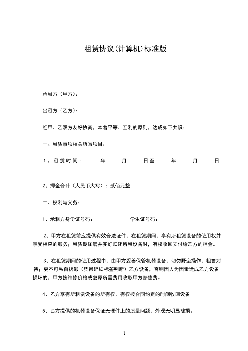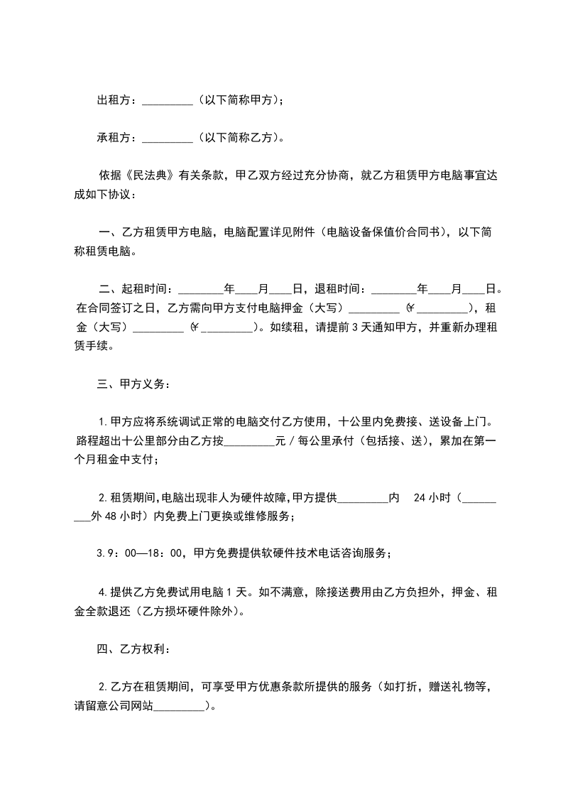 4.提供乙方免费试用电脑1天。如不满意,除接送费用由乙方负担外,押金、租金全款退还(乙方损坏硬件除外)。