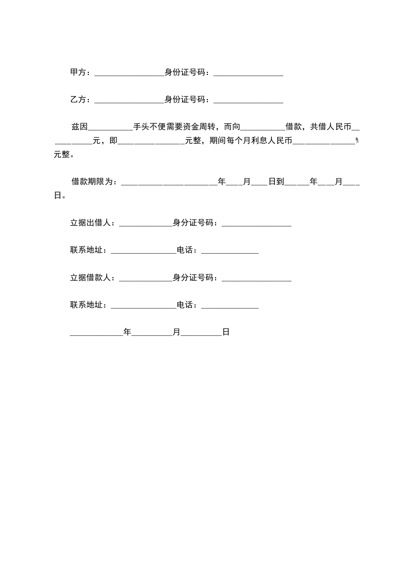 兹因___________手头不便需要资金周转,而向___________借款,共借人民币___________元,即________________元整,期间每个月利息人民币_______________%元整。