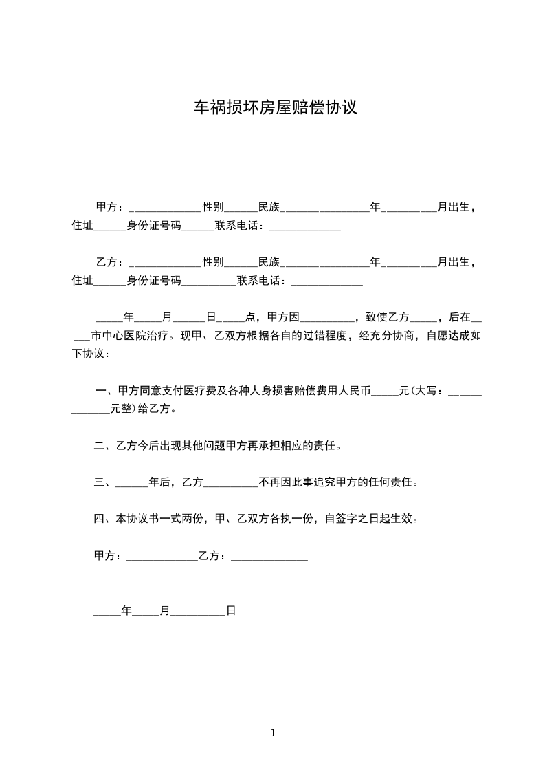 _____年_____月______日_____点,甲方因__________,致使乙方_____,后在_____市中心医院治疗。现甲、乙双方根据各自的过错程度,经充分协商,自愿达成如下协议: