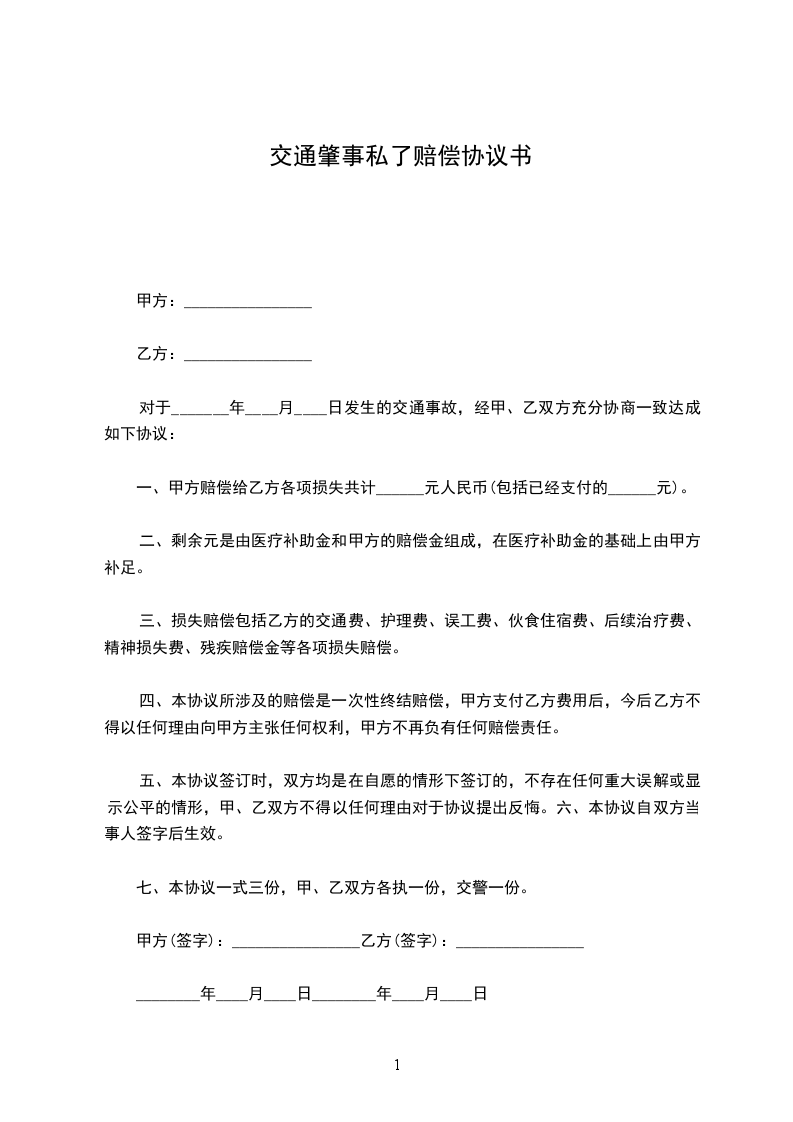 对于_______年____月____日发生的交通事故,经甲、乙双方充分协商一致达成如下协议: