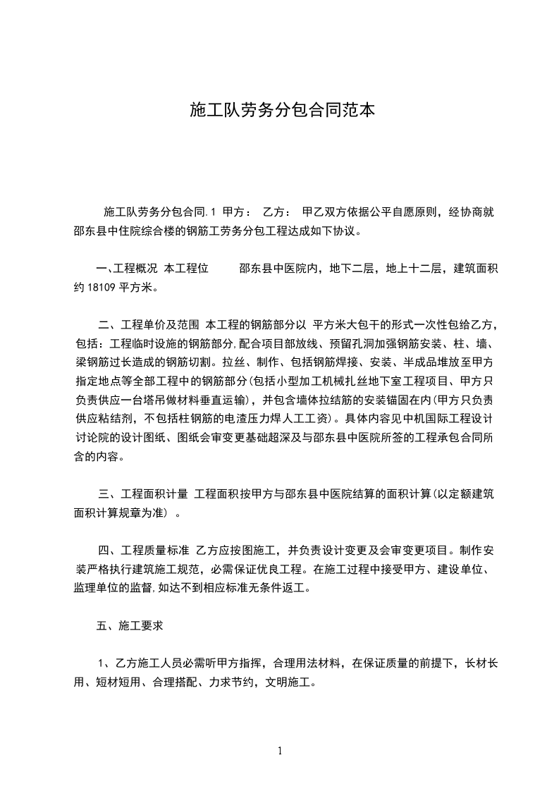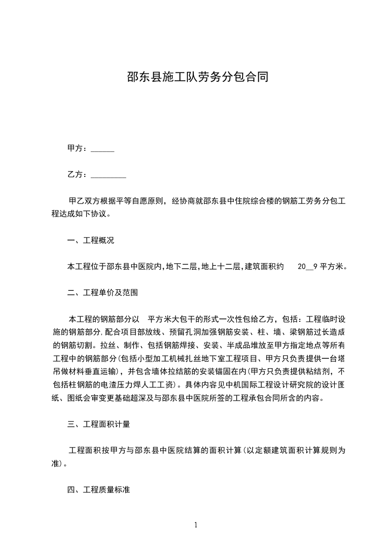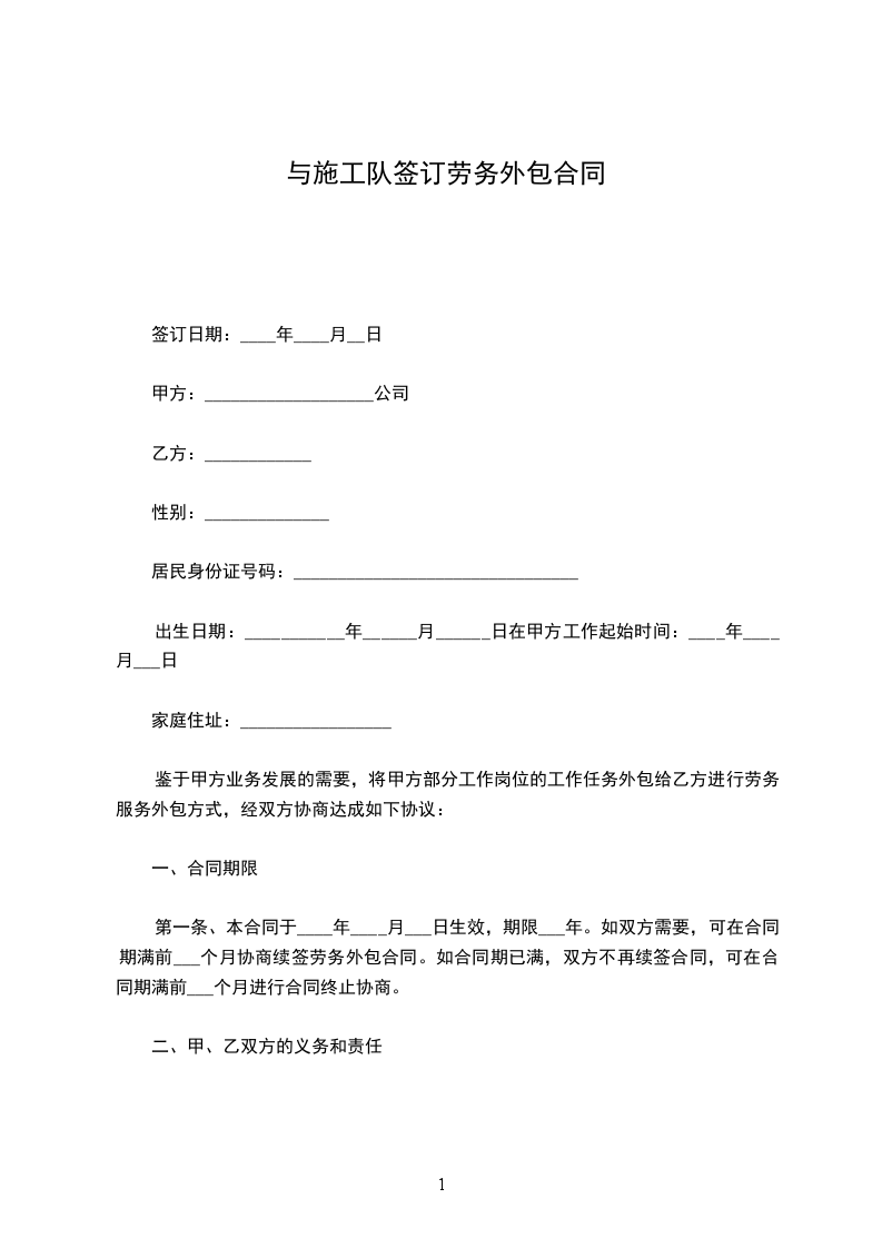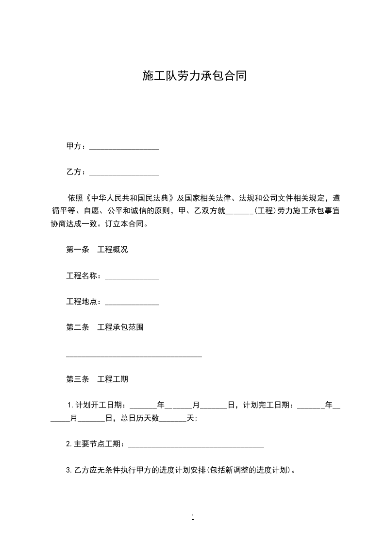 依照《中华人民共和国民法典》及国家相关法律、法规和公司文件相关规定,遵循平等、自愿、公平和诚信的原则,甲、乙双方就_______(工程)劳力施工承包事宜协商达成一致。订立本合同。